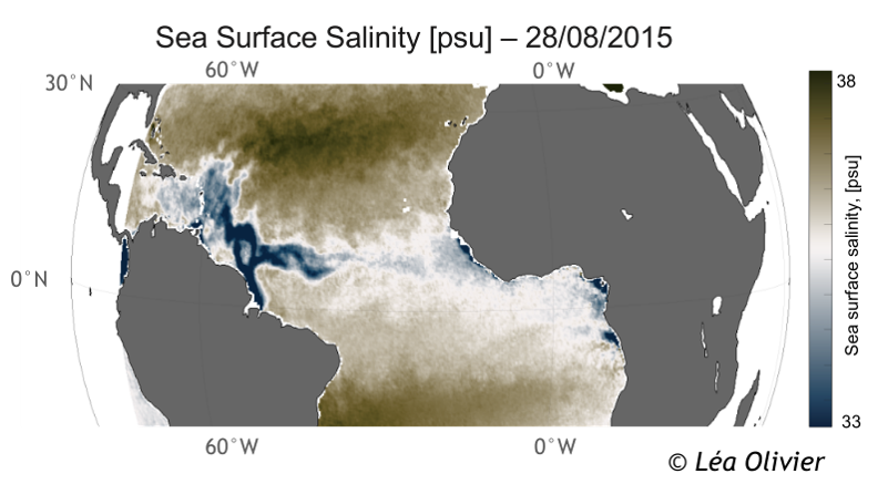 L'eau douce relâchée dans les océans par les fleuves, les précipitations ou par la fonte de la glace forme des lentilles d'eau douce à la surface de l'océan. SMOS a montré que ces lentilles d'eau douce sont transportées par les courants de surface et peuvent rester visibles pendant plusieurs semaines voire quelques mois avant de se mélanger et disparaitre.