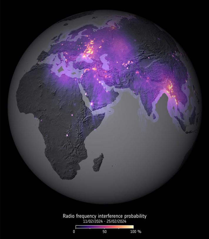 SMOS observe dans une bande complètement protégée, réservée à l'astronomie. Pourtant, de fortes interférences liées aux activités humaines dégradent le signal dans certaines régions. Certaines ont été éteintes depuis son lancement, signalées grâce à une localisation précise des sources, mais d'autres persistent, particulièrement dans les zones de conflits.