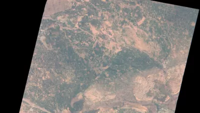 Image des landes acquise par le satellite Formosat-2 il y a 20 ans. La végétation y apparait en rouge. Un voile atmosphérique est présent. -