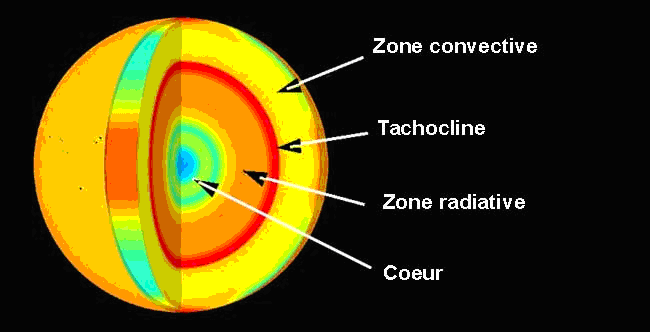 La sismologie depuis l’espace a permis de montrer que les couches du Soleil les plus proches de la surface, formant la zone convective, accompagnent la surface visible dans sa rotation alors que la partie interne, le noyau du Soleil, tourne en seul bloc, comme un corps solide. La séparation entre les deux régimes de rotation se produit aux 2/3 de l’intérieur du Soleil. Cette frontière a été dénommée tachocline.