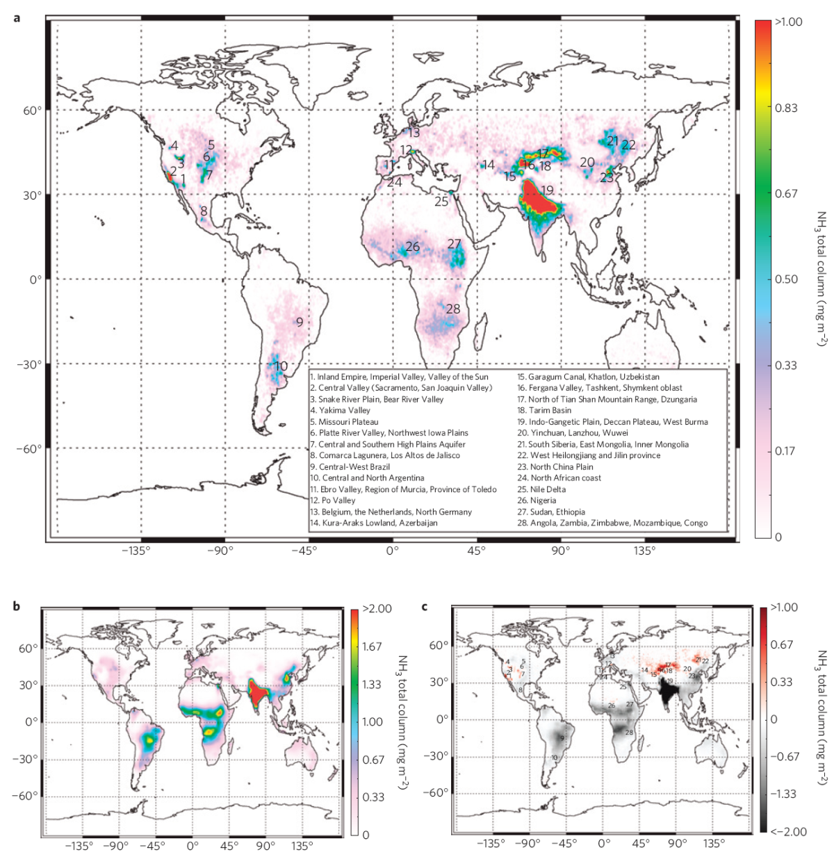 En filtrant les données sur l'ammoniac et en les cumulant pendant une année d’observation en continu (plus d’un million de mesures par jour, avec deux passages par jour en tout point du globe), ils ont obtenu des cartes de concentration et les ont comparées aux modèles atmosphériques.