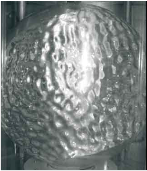 La micropesanteur a permis d’étudier la turbulence d’ondes à la surface d’un fluide couvrant la paroi interne d’une sphère transparente animée d’un mouvement oscillatoire (source de mouvement) (voir ci-contre).