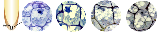 Le cytoplasme (contenu d’une cellule vivante) des racines de végétaux contient différentes structures spécialisées :