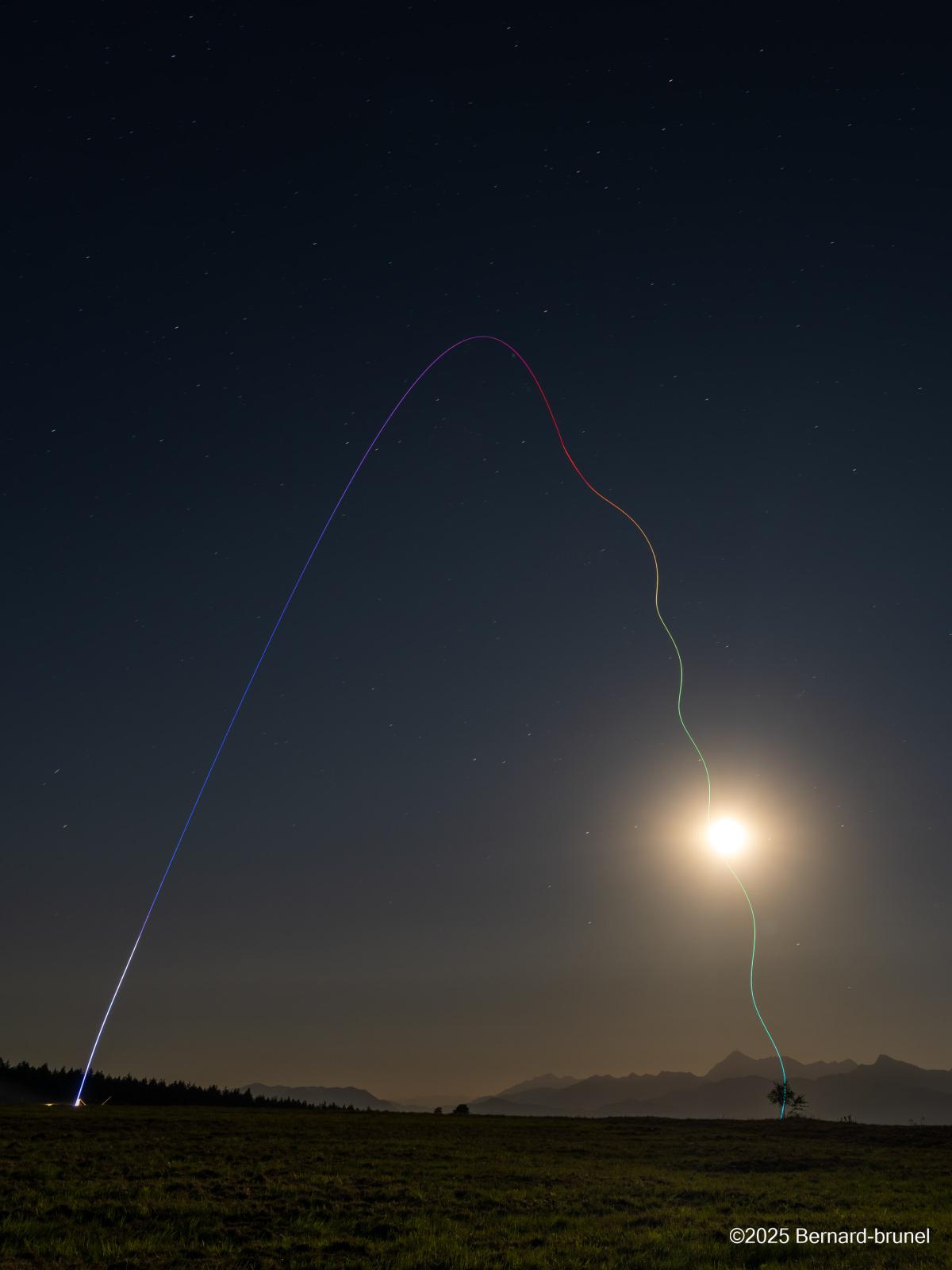 Lancement nocturne d’une minifusée illuminé par la pleine Lune. © Bernard Brunel, 2025