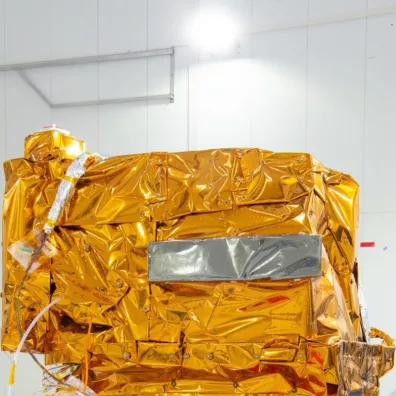 « Sur la photo, on peut voir l’instrument sur la partie supérieure (le plus gros parallélépipède) et la plateforme dessous. L’ensemble est recouvert d’une couverture isolante dorée, sorte de couverture de survie. »