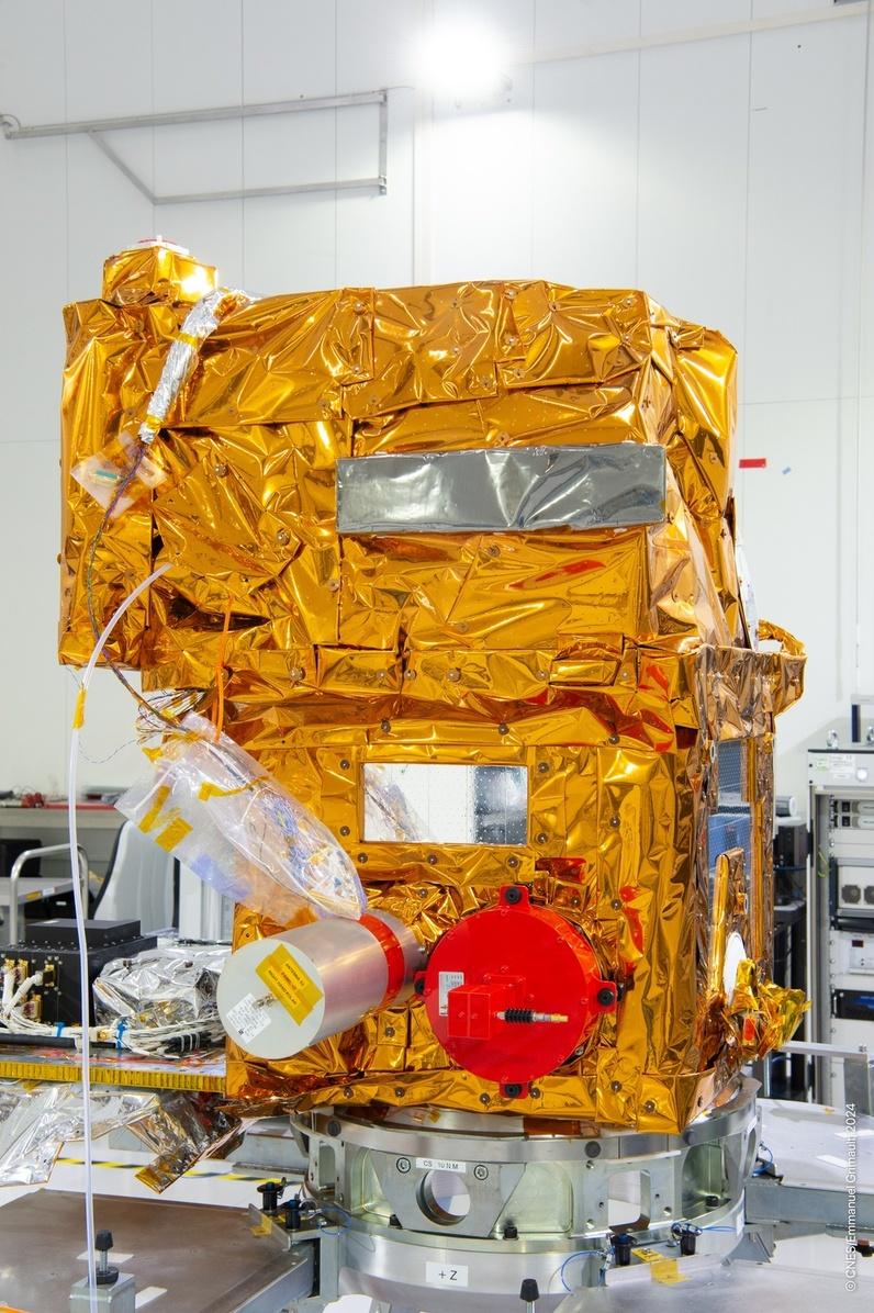 « Sur la partie inférieure, on observe un panneau de la plateforme Myriade développée par le CNES. Les tubes gris et rouge sont des capots qui sont démontés juste avant le lancement du satellite. Derrière, on trouve deux antennes radio : celles-ci permettent aux équipes au sol de communiquer avec le satellite. L’antenne bande S (capot gris) sert à envoyer les instructions au satellite et transmettre ses paramètres de suivi, tandis que celle en bande X (capot rouge) transmet les mesures sciences de l’instrument. Enfin, le rectangle gris sur le satellite (le plus petit des deux) est un radiateur qui permet de refroidir certains équipements du satellite. »