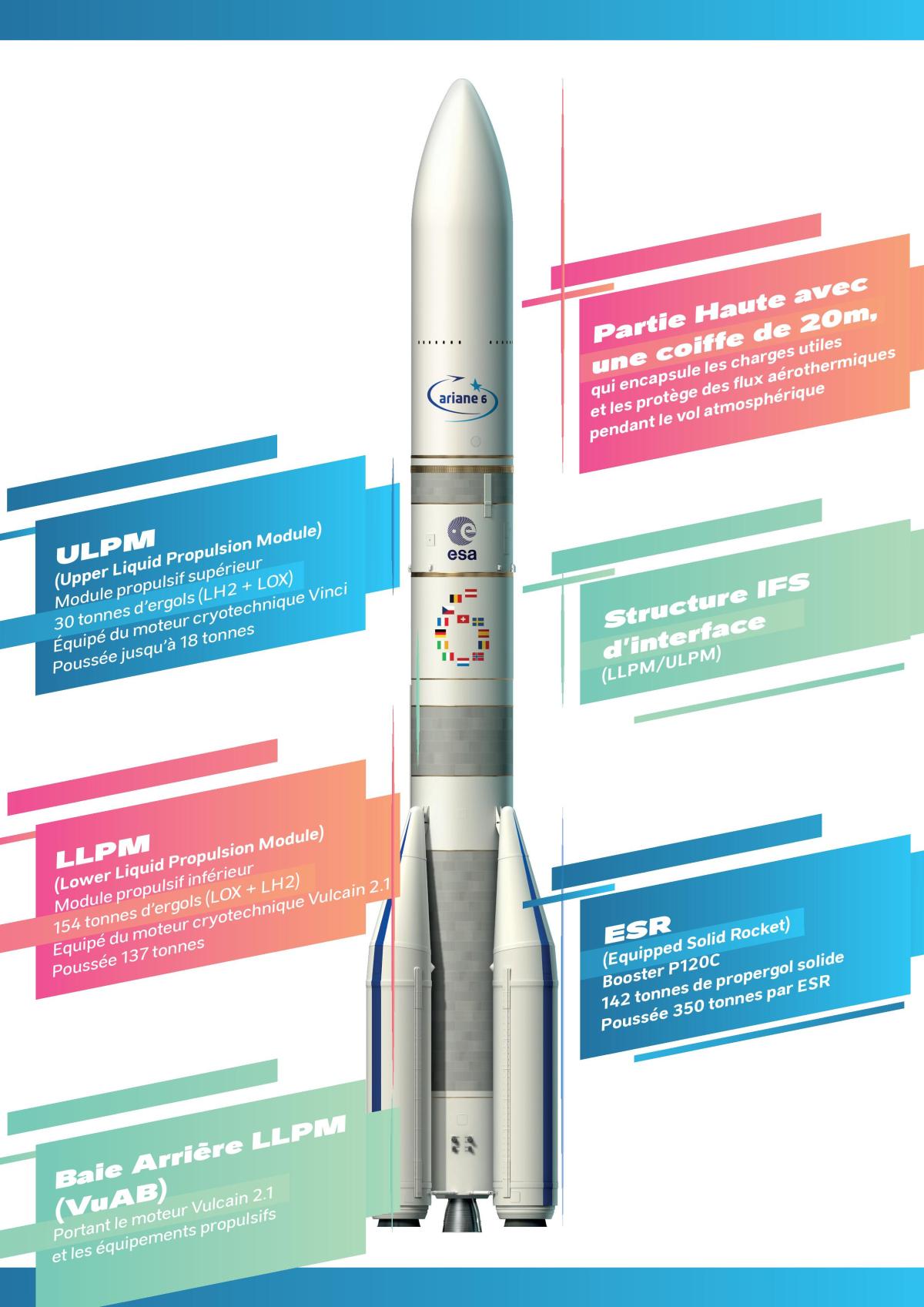 Haut de 62 m, le lanceur Ariane 6 est composé de 4 modules principaux, qui jouent chacun un rôle bien précis durant le vol spatial. Pour le décollage et l’essentiel du vol atmosphérique, ce sont les modules ESR (Equiped Solid Rocket) qui assurent la majeure partie de la poussée.