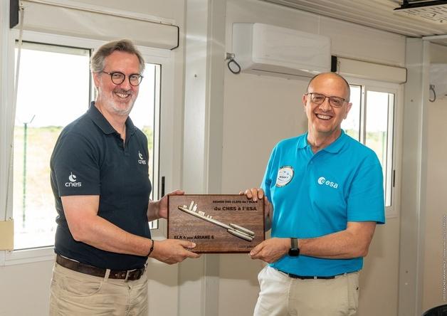 Maître d’œuvre de la construction des installations de lancement d’Ariane 6 depuis 2015, le CNES en a officiellement transféré la propriété à l’ESA. Cette remise de clés symbolique vient récompenser la qualité du travail réalisé par les centaines de personnes impliquées dans le programme pour construire ce pas de tir remarquable.