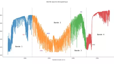 IASI-NG produit des spectres, des courbes, à partir du rayonnement infrarouge émis par la Terre. Ceux-ci renseignent sur la colonne d’atmosphère que les infrarouges ont traversé. Lors de leur traversée, les rayons infrarouges interagissent en effet avec les molécules de gaz (voire des fines poussières) qu’ils rencontrent. Ils sont soit absorbés, soit réémis. Ce qui forme dans le spectre des creux et des bosses que l’on sait attribuer, selon la longueur d’onde, à telle ou telle molécule. On (enfin, les spécialistes) peut donc en déduire quelle molécule (dioxyde de carbone, vapeur d’eau, ozone, dioxyde de souffre…) est présente, entre le sol et le sommet de l’atmosphère, à quelle altitude et en quelle quantité.