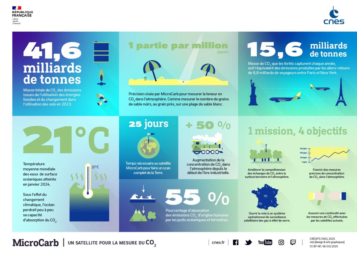 Le microsatellite, développé par le CNES, a été financé par le programme des Investissements d’avenir avec la contribution de l’Union Européenne et de l’agence spatiale du Royaume-Uni (UKSA). Il embarque un spectromètre infrarouge, instrument scientifique qui analysera la lumière du Soleil réfléchie par la surface de la Terre et des océans pour en déduire la proportion de CO2 dans la colonne d’atmosphère sur des pixels rectangulaires de 4 x 9 km². MicroCarb permettra ainsi de mesurer avec une précision recherchée inférieure au ppm (partie par million) les sources et les puits de carbone à l’échelle du globe et les échanges entre eux.