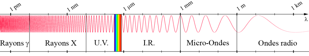 Au quotidien, nous rencontrons différents types d’ondes : visibles (la seule perçue par notre œil), mais aussi rayons UV (dont nous protégeons notre peau en été), rayons X (lorsque nous passons une radiographie) ou encore ondes radio (qui servent à diffuser et écouter notre émission préférée). Les rayons gamma sont à gauche du spectre électromagnétique, ils ont la fréquence la plus élevée et la plus petite longueur d’onde.