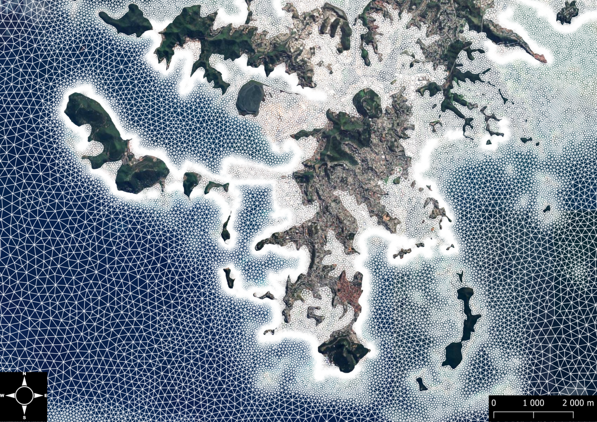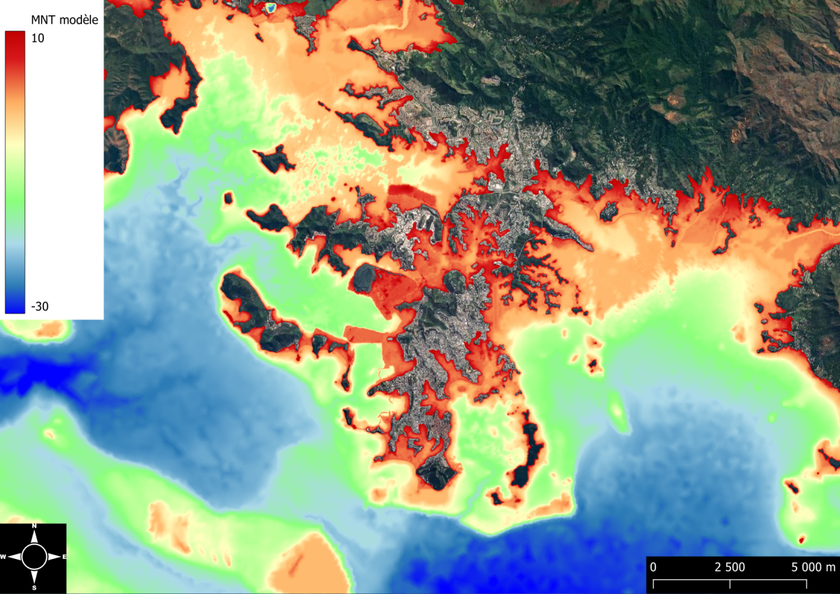 En Nouvelle-Calédonie, nous explorons le potentiel des satellites pour alimenter un jumeau numérique permettant de faire des modélisations de submersion marine. Nous nous concentrons dans un premier temps sur la zone de Nouméa, qui concentre la majeure partie de la population et des enjeux à l’échelle de l’île. Une première ébauche de jumeau numérique de submersion marine a ainsi été réalisée par le BRGM. Il permet par exemple d’évaluer la hauteur d’eau atteinte lors d’un évènement d’inondation et les vitesses des courants sur les secteurs inondés.