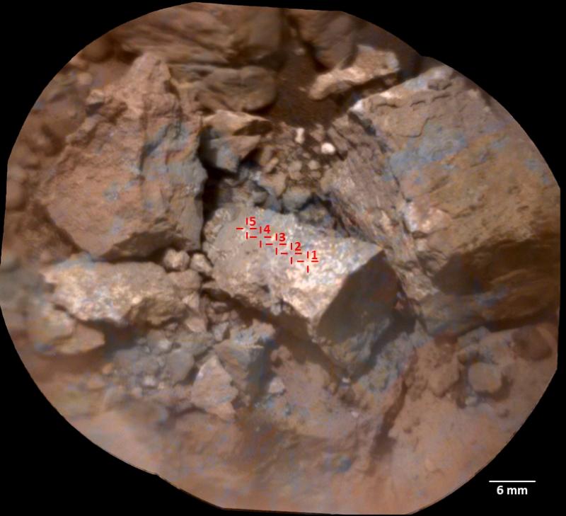 D’autres observations récentes ont été déterminantes dans le choix de cette cible : des cristaux de soufre ont été découverts dans une vallée du mont Sharp, que le rover gravit actuellement. Les scientifiques se demandent si cette roche présentera les mêmes propriétés…