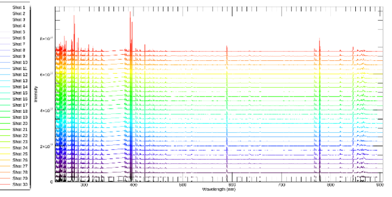 Comme d’habitude, plusieurs points de mesure ont été fait sur cette cible, 5 au total. Et sur chaque point, plusieurs tirs : 30 en tout. Chaque tir aboutit à l'obtention d'un spectre qui donne des informations et enrichit la base de données des compositions martiennes.