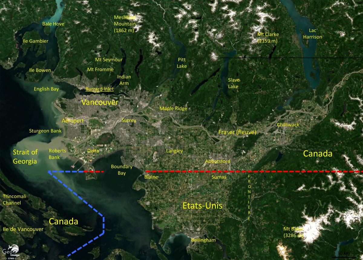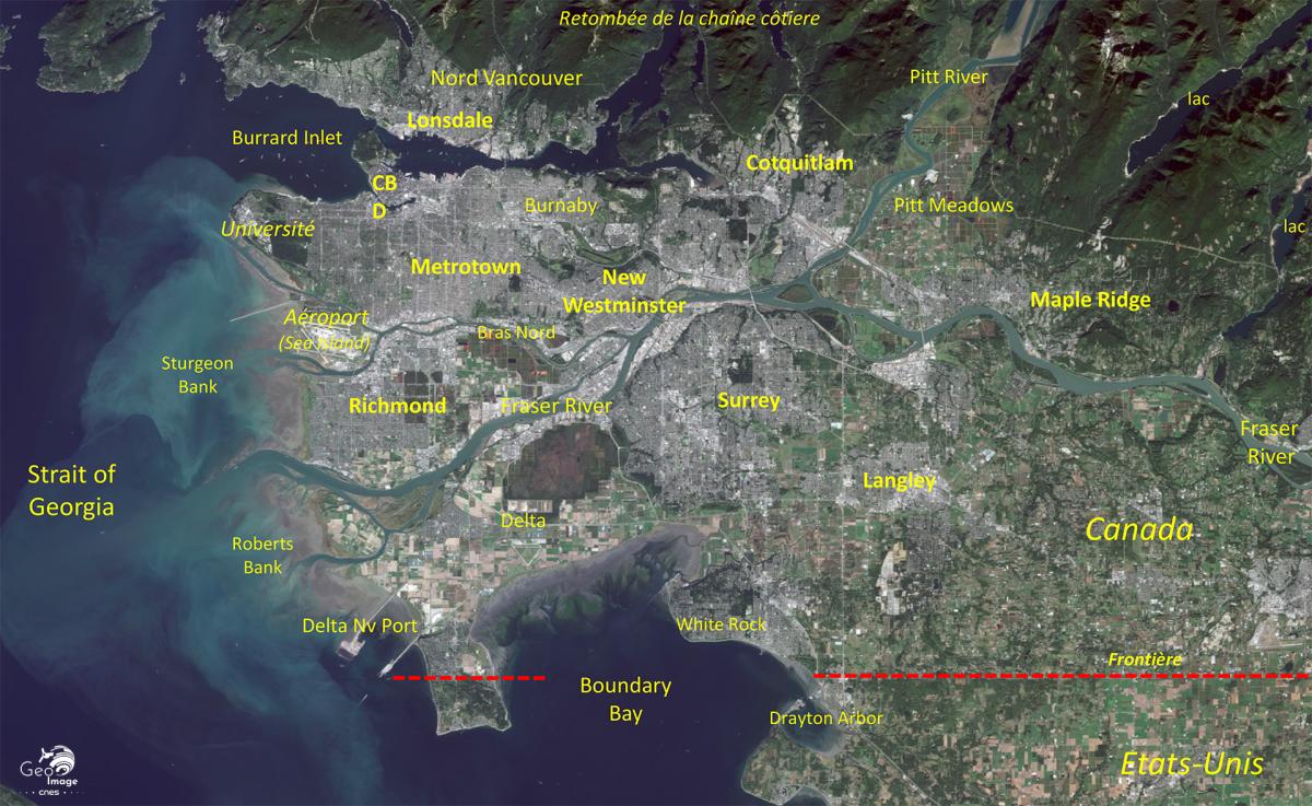 A l’échelle régionale, cette image présente un vaste système montagnard, largement boisé et dominé par de hauts sommets enneigés ou englacés, qui tombe dans une mer bordée au sud-ouest par une succession d’iles très découpées. Au centre-est de l’image apparaît un fleuve - la Fraser - sortant des montagnes ; il va organiser un vaste triangle de basses terres littorales en position d’abri. Cette région constitue un phénomène exceptionnel et apparaît comme un véritable « oasis ». Il est en effet densément peuplé, bien mis en valeur au plan agricole et constitue le site de la grande métropole de Vancouver. Dans ce Grand Ouest Pacifique de l’Amérique du Nord, cet espace est si rare par sa taille, ses atouts et ses qualités que son contrôle a été l’enjeu de fortes rivalités géopolitiques et géostratégiques entre le Canada, au nord, et les Etats-Unis, au sud. Bien visible de l’espace, la frontière coupe la région en deux.