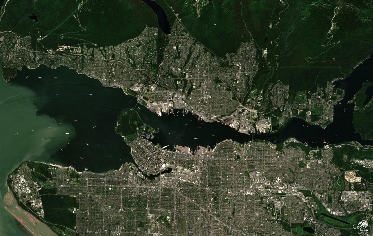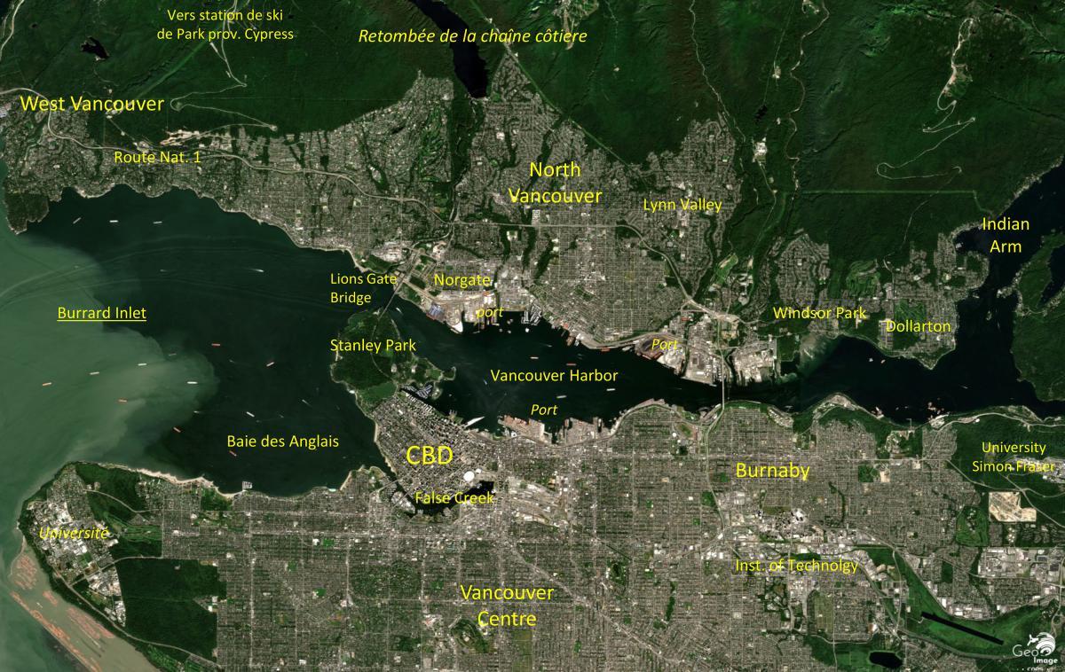 La première image couvre une large partie du Vancouver Harbor et du Burrard Inlet. Les fonctions portuaires, et la spécialisation fonctionnelle des espaces littoraux (bacs, ferries, croisière, conteneurs, chimie, charbon, chantiers navales…), y apparait avec une grande netteté.