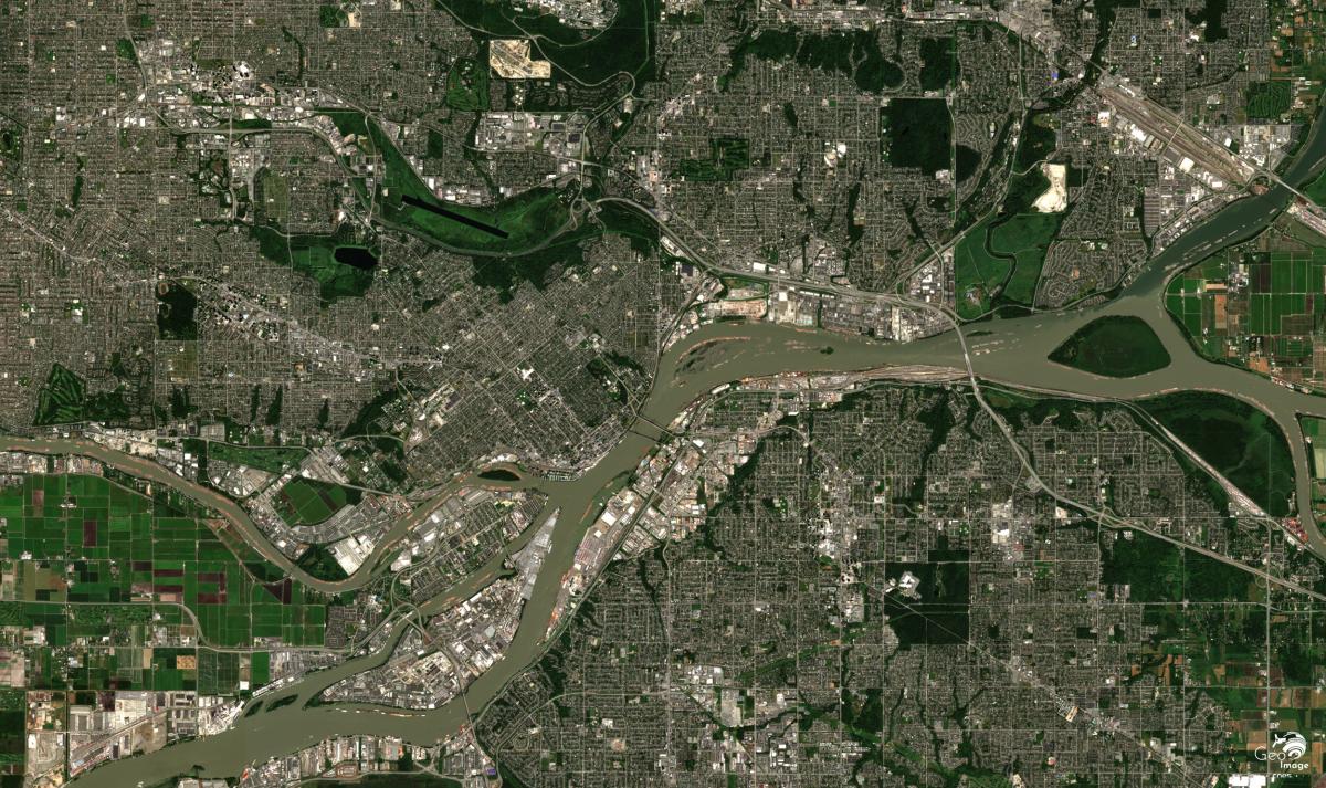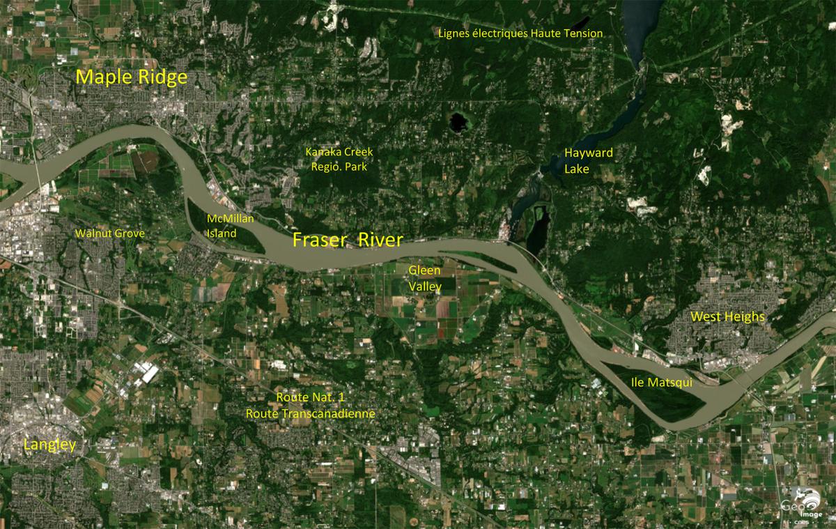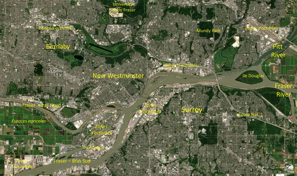 Cette image couvre la vallée de Fraser River dans la traversée centrale de l’agglomération entre les communes de New Westmintser, de Burnaby et de Surrey. A l’est de l’image, l’ile Douglas se situe à la confluence de la Fraser River et de la Pitt River, les eaux des deux étant de couleur bien différente en lien avec la charge alluviale. A l’ouest de l’image, un peu à l’amont de l’ile Annacis, la Fraser se sépare en deux, avec un bras Nord et un bras Sud. Ce phénomène est important dans la mesure où ces deux bras vont enserrer une très grande ile.