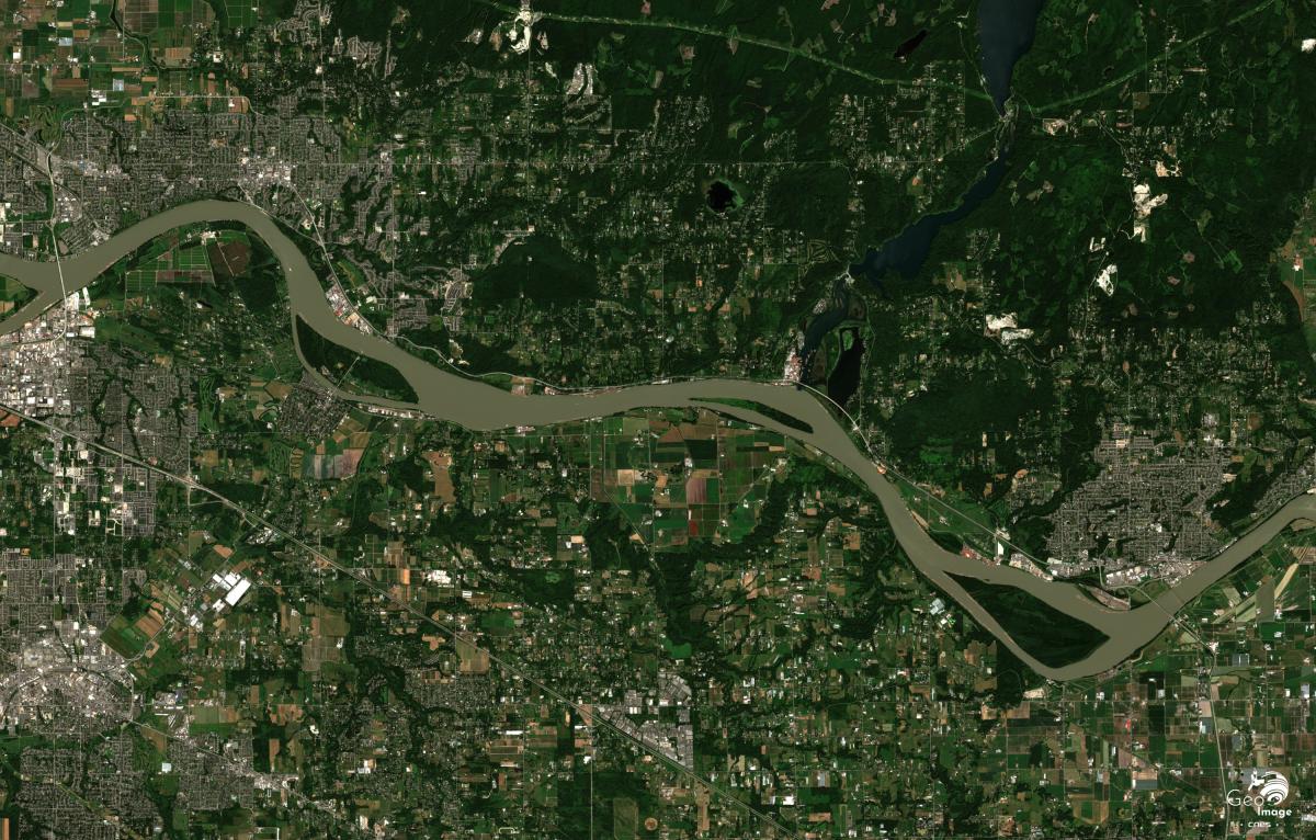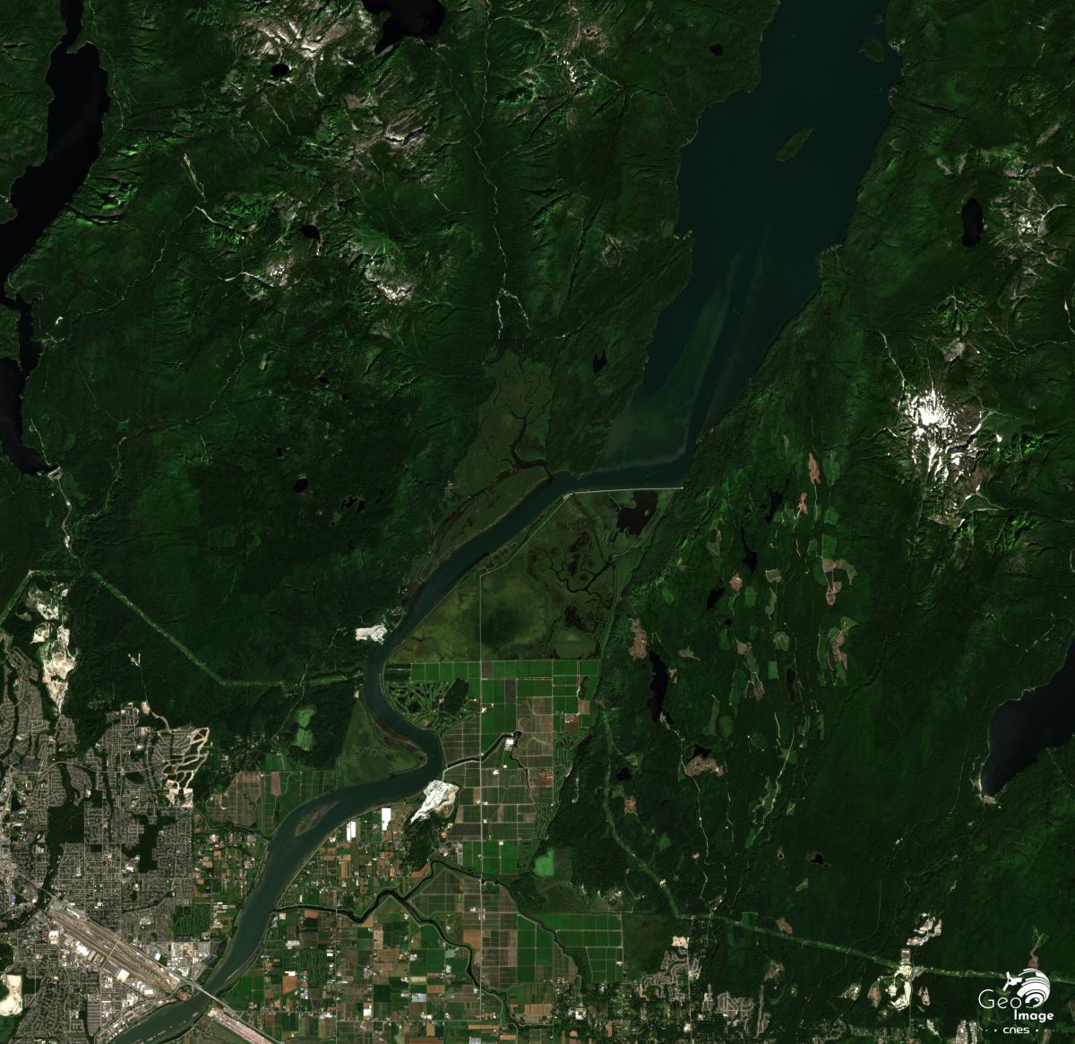 Au centre, enfin, se déploie un vaste delta s’avançant dans la mer. L’image prise à marée basse témoigne, sur cette côte, du jeu des marées, qui dégage ici des estrans assez larges. Nous sommes dans le delta de la Fraser, un puissant fleuve qui traverse l’image d’est en ouest, et est rejoint au nord-est par la Pitt River. Longue de 1370 km, la Fraser River est le plus long fleuve de Colombie britannique. Son puissant débit de printemps est lié à la fois à la taille du bassin hydrographique de 220 000 km², aux importantes précipitations qui tombent sur la Chaîne littorale et à son régime nival, c’est-à-dire dominé par les eaux de la fonte des neiges de mai à juillet.