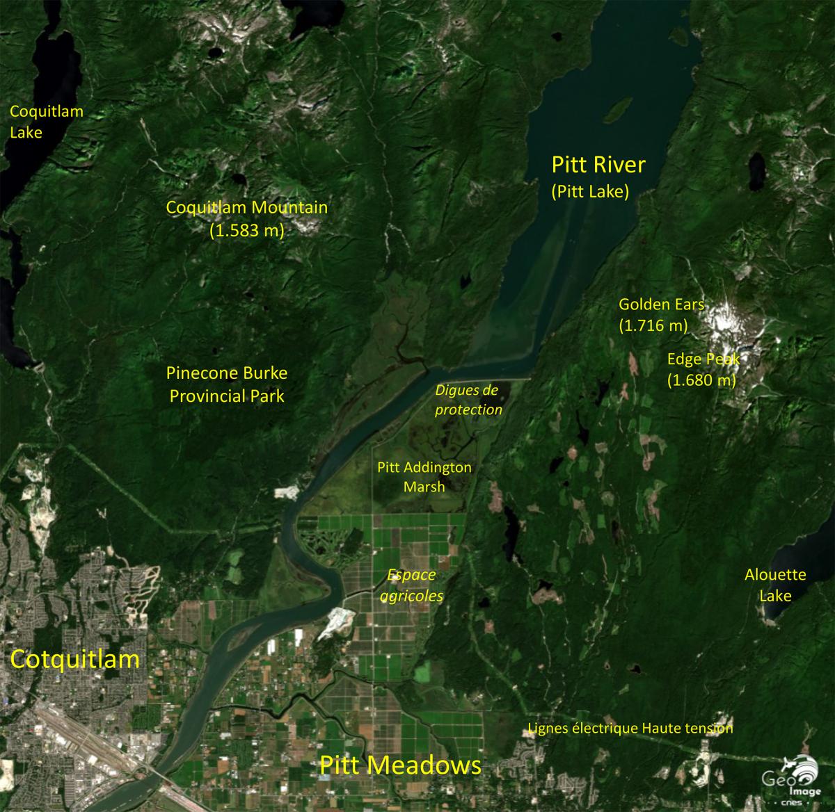 A la sortie de la Pitt River de la montagne, où elle se déploie sous forme d’un grand lac dans un ancien fjord glaciaire, la rivière a été canalisée par de puissantes digues de protection afin de faire face aux crues de printemps liées à la fonte des neiges. Les marais de la Pitt Addington Marsh servent de zone tampon entre la rivière et les espaces agricoles situés au sud dont le quadrillage régulier du parcellaire est bien visible.