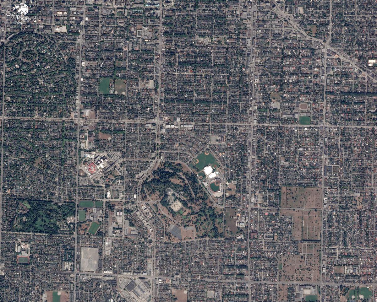 Au centre se trouve le Parc Queen Elisabeth, avec au nord-est son centre aquatique, bien repérable par son toit blanc, et son mini-golf, et au nord-ouest le grand complexe hospitalier du BC Children‘s Hospital. A la limite ouest s’étend le rectangle vert du jardin botanique. Mais l’intérêt principal de cette image zoom est de nous rappeler l’importance, même au Canada et à Vancouver, des phénomènes de ségrégation spatiale de l’habitat. A cet égard, l’opposition entre le bord ouest et le bord est de l’image est significatif. Au nord-ouest, deux îlots résidentiels très privilégiés sont bien identifiables au nord du jardin botanique au sud de la forme ronde dessinée par le Shaughnessy Park près duquel se trouve d’ailleurs le Consulat de la République populaire de Chine (taille des parcelles et des maisons, taux de verdissement du cadre de vie, piscines ou tennis privés…).