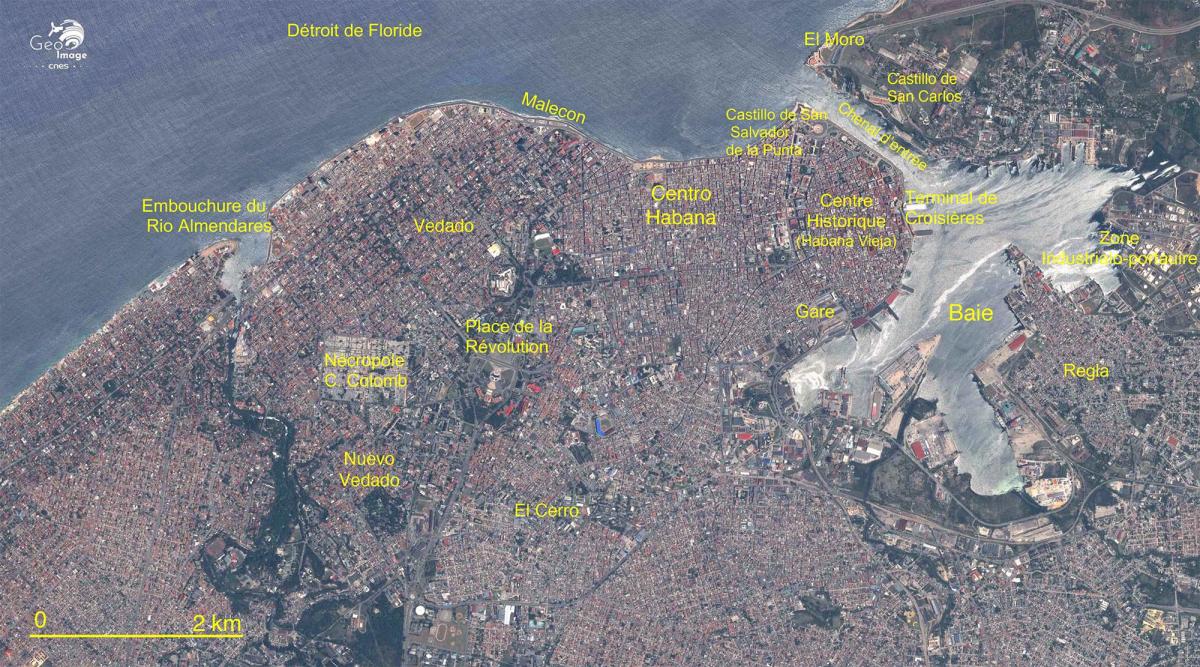 La baie et les installations portuaires constituent donc le centre économique de la ville qui se déploie tout autour. Les quartiers centraux se repèrent assez bien, en particulier la vieille Havane, à l’ouest, en forme de demi-cercle, qui présente de nombreux quais et zones d’appontement et un plan en damier, de type colonial, très caractéristique. C’est là que se trouvent les principaux monuments et rues coloniales prisées des touristes (voir zoom 1). Au sud, dans le prolongement de la pointe que l’on repère au centre de la baie, se trouve un autre quartier d’habitation, Regla. De part et d’autre se situent les zones portuaires (voir zoom 1). La rive nord est nettement moins urbanisée. La ville s’étend surtout vers le sud-ouest et le long du littoral à l’ouest et notamment vers l’aéroport (voir zoom 2).