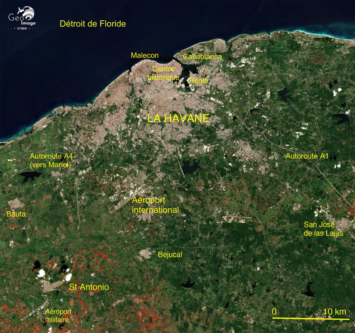 L’image satellite permet de mettre en évidence la déficience des infrastructures pour cette ville qui reste relativement peu ouverte sur le monde en raison de l’embargo imposé par les Etats-Unis contre Cuba depuis le 3 Février 1962. Cette faiblesse des infrastructures se perçoit avec le port de Mariel à l’ouest, dont l’étendue spatiale reste très faible, surtout quand on sait qu’il s’agit du premier port de conteneurs du pays. On peut également remarquer la faiblesse des infrastructures routières et ferroviaires qui témoignent du faible taux d’équipement automobile de la population cubaine : les spécialistes estiment à moins de 200 000 le nombre de voitures en circulation à Cuba (environ 60 000 voitures américaines datant de la période Batista, 60 000 voitures soviétiques datant de la Guerre froide et 60 000 voitures asiatiques importées depuis la chute l’URSS).