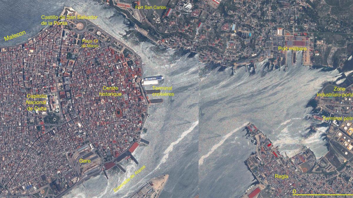 La Havane est située au nord-ouest de Cuba, quasiment face à Miami, à 370 kilomètres à vol d’oiseau, sur le détroit de Floride. Le port présente un site de baie exceptionnel, aménagé au fil des siècles, à partir de 1515 à l’époque moderne où Cuba était une possession espagnole (de 1492 à 1898). La couronne d’Espagne a rapidement compris la situation stratégique de La Havane au cœur du Grand Bassin caraïbe qui devint la principale escale sur la route des Indes. On peut distinguer sur la photo le canal d’entrée, au nord le fort El Morro, avec son canon qui retentit encore chaque jour, et au sud le Castillo de San Salvador de la Punta. Un tunnel permet aujourd’hui de relier les deux rives.