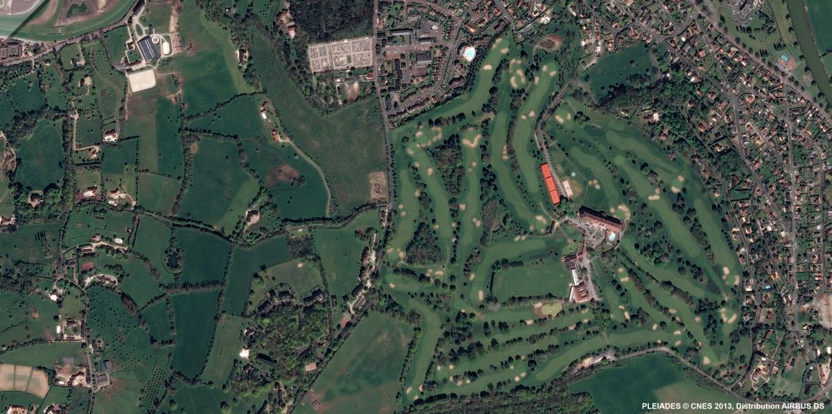 Construit à la fin des années 1920 en style Art Déco sur les restes d’un château du XVIIe siècle, le 3e grand hôtel du groupe Barrière participe à faire du territoire touristique une destination du tourisme golfique (parcours à 27 trous, bien visibles sur l’image). Sur près de 70 ha, cet établissement dispose d’autres équipements que l’image permet d’identifier, comme la piscine, l’alignement de cours de tennis au nord de l’hôtel avec, à leur droite, l’hélisurface de l’hôtel (plafeforme d’accueil des hélicoptères, de couleur bleutée).