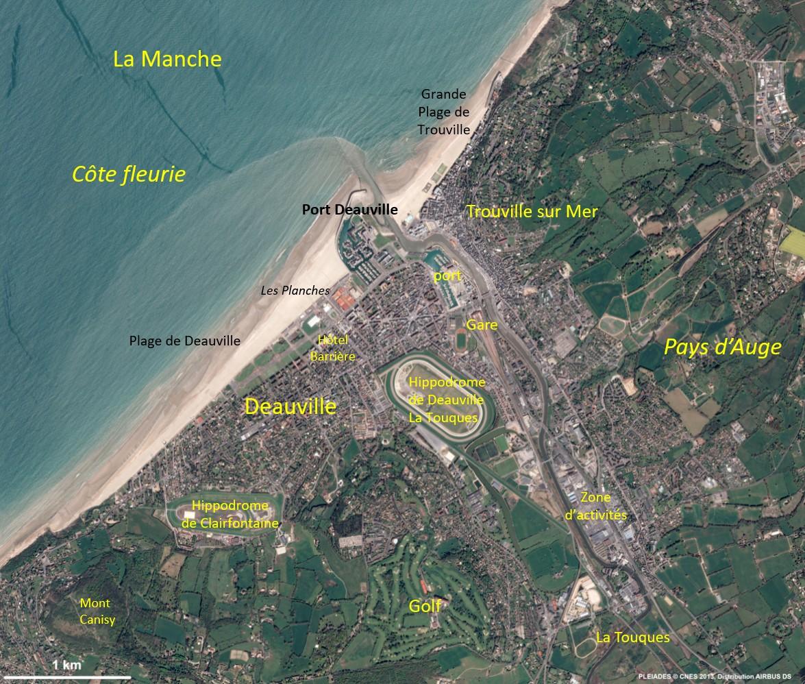 D’orientation sud-ouest / nord-est, la portion de littoral visible sur cette image est coupée verticalement par le bassin versant de la Touques, petit fleuve côtier séparant Trouville (sur la rive droite) de Deauville (sur la rive gauche), identifiable par ses deux hippodromes et son plan en damier, véritables géomarqueurs de cette station. L’estuaire de la Touques est ainsi intégralement englobé dans la matrice urbaine, sa zone d’accrétion sablo-vaseuse à l’embouchure du fleuve ayant pratiquement disparu en raison de nombreux aménagements.