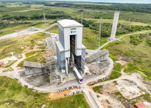 Puis l’ensemble est transféré – toujours à l’horizontal -, vers le pas de tir, sous une énorme structure de métal, le portique. C’est là que sont ajoutés les propulseurs, ainsi que la coiffe renfermant le satellite. Quelques heures avant le décompte final, le portique mobile, 8 000 tonnes sur la balance (quasiment la masse de la Tour Eiffel), recule d’une centaine de mètres pour laisser Ariane 6 libre de s’envoler.