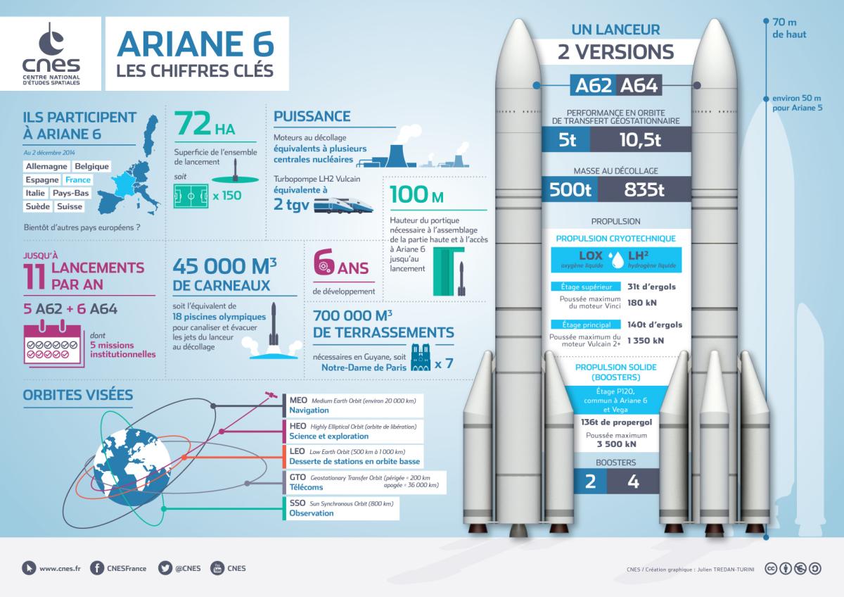 - Enfin, tout en haut, la coiffe, 20 mètres de haut, renferme et protège le (ou les) satellite(s). La coiffe représente moins de 1% de la masse totale de la fusée. C’est la cerise sur le gâteau ! Elle est larguée quand la fusée quitte l’atmosphère à plus de 100 km d’altitude. C’est aussi dans la coiffe qu’embarquent les astronautes dans le cadre des vols habités, dans la fusée russe Soyouz ou dans le Falcon 9 de Space X par exemple. Ariane 6, elle, n’est pas conçue pour cela.