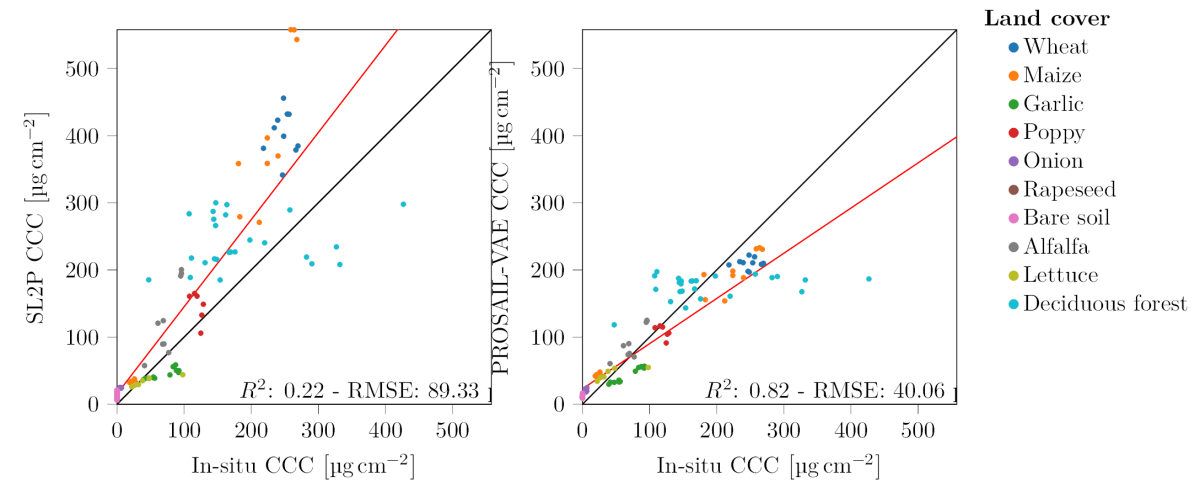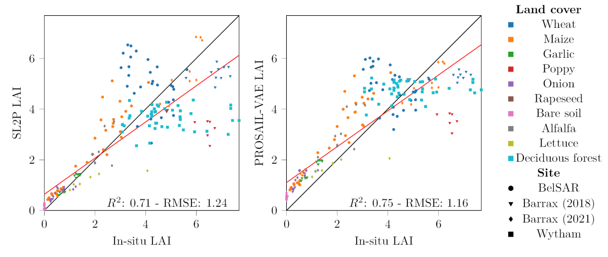In conclusion, in less than a year, this work has produced results very close to the state of the art for LAI estimation, and even better for chlorophyll content. Its huge advantage lies in the fact that, since it is trained on real observations, the variable distributions are realistic by construction. However, this method requires that the physical model used be derivable to enable gradients to be calculated. It is the case for PROSAIL.
