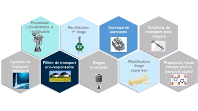 Cet objectif couvre les domaines/métiers principaux des systèmes de transport spatial : Système (y compris interactions entre véhicule et pas de tir), Propulsion Liquide, Propulsion Solide, Structure et Matériaux.