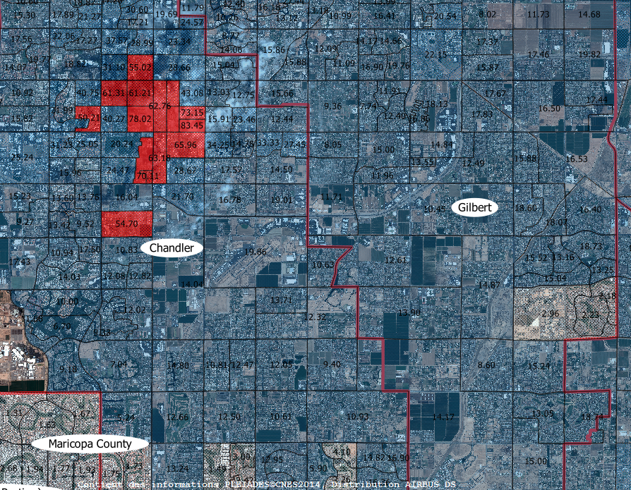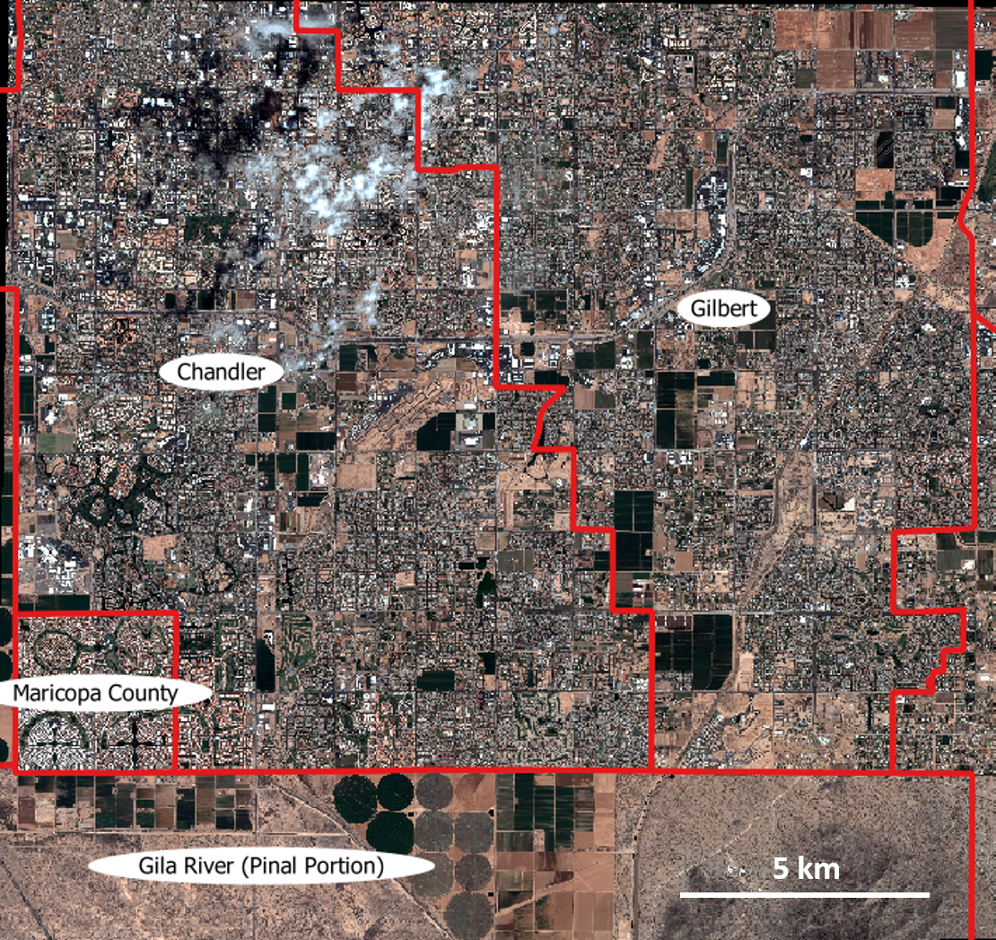 Dans ce contexte général, l’aire urbaine de Phoenix passe entre 1960 et 2017 de 728 183 habitants à 4,737 millions d’habitants, soit de 56 % à 65 % du total de la population de l’Arizona. Elle se révèle donc très dynamique et très attractive puisqu’elle polarise à elle seule 67 % du total de la croissance démographique de l’Etat de l’Arizona des six dernières décennies. Les villes de Chandler et de Gilbert présentes sur cette image font partie du Comté de Maricopa : il est le plus peuplé de l’Etat puisqu’il regroupe plus de 4.1 millions de personnes et 9 des 10 plus grandes villes arizoniennes.