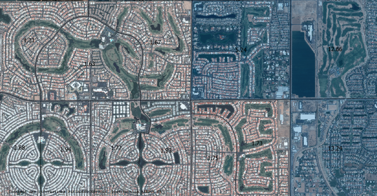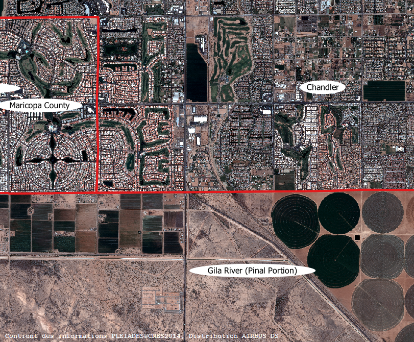 En effet, en faisant apparaitre grâce au SIG QGIS les délimitations des différentes municipalités qui composent l’entité urbaine de Phoenix dans cet espace, on note dans cette région que l’extension des habitations correspond de manière exacte avec la ligne de séparation entre Chandler/Gilbert d’une part et Gila River/Gila River Indian Community. La présence au sud de cette image d’un territoire placé sous l’autorité de tribus indiennes explique la forme du front d’urbanisation.