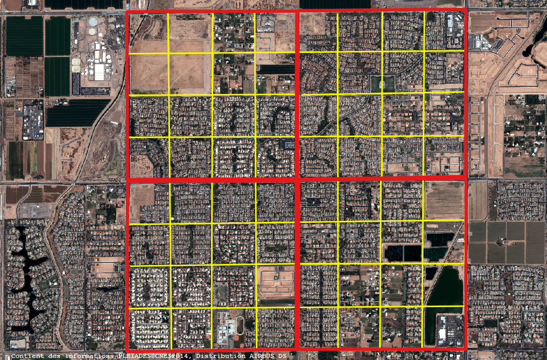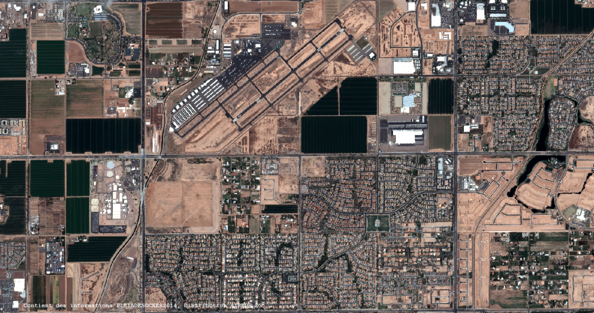 Les deux images permettent donc de montrer comment les terres agricoles ont quasiment disparu sous les effets de la croissance urbaine de Chandler. Rappelons qu’entre 2001 (date de l’image d’occupation des sols) et 2014 (date d’acquisition de l’image Pléiades de Chandler), la population de la ville est passée de 176 000 à 240 000 habitants. Cette image peut également être comparée avec celle du zoom 1 puisque les divisions en sections ont été réutilisées : on note que pour la plupart des zones dans le quadrillage jaune, il s’agissait en 2001 de zones agricoles qui ont été urbanisées sur l’image de 2014.