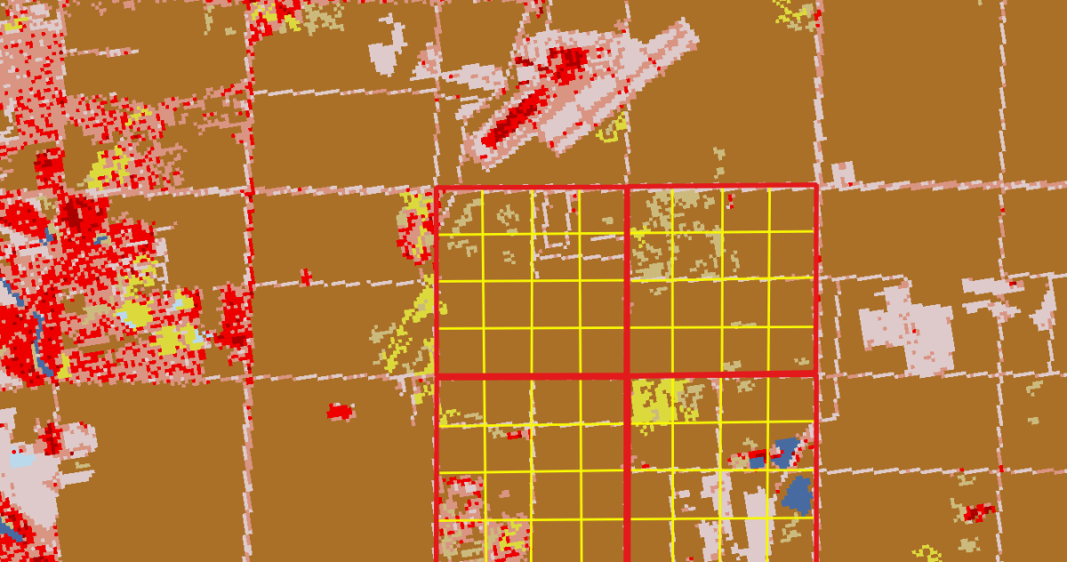 Comme le montre l’outil de mesure du logiciel QGIS, ces carrés très réguliers de couleur rouge mesurent 1 mile de côté (soit 1, 6 km) : cette division géométrique de base est un marqueur de la colonisation du territoire étasunien et témoigne du système du Township mis en place en 1785, puis généralisé de l’est vers l’ouest au fur et à mesure de l’avancée du front pionnier, de la saisie puis de la mise en valeur des terres. Chaque township constituait un carré de 6 miles de côté et était divisé lui même en 36 sections de 1 miles de côté (en rouge sur l’image). Chacune de ces sections était à son tour divisées en 16 lots (appelés « quarts ») qui couvraient chacun une surface de 40 acres (soit 16, 2 hectares) (en jaune sur cette image). En 1785, cette surface approximative de 16 ha était considérée comme suffisante pour faire vivre une famille de fermiers.