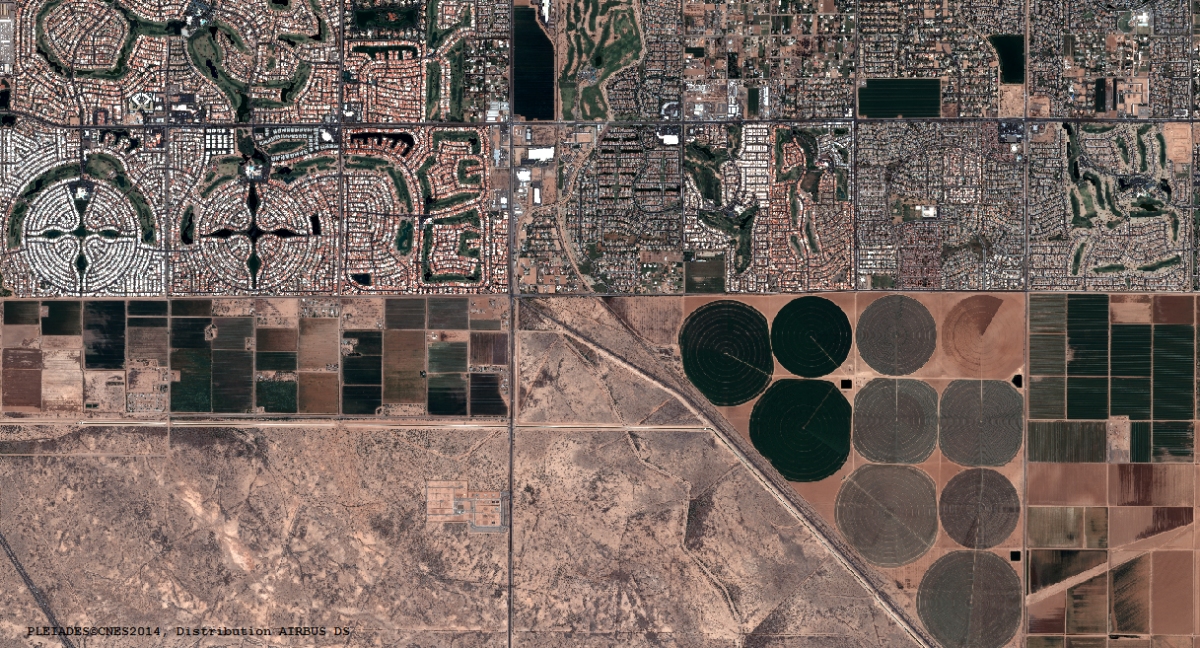 Cette image permet d’aborder la question de la croissance urbaine dans un milieu fortement contraignant, le désert de Sonora en Arizona. La croissance urbaine de cette région est depuis le début des années 1990, une des plus dynamiques aux États-Unis. Ce bouleversement a connu son apogée dans les années 2000 lorsque l’Etat de l’Arizona occupait régulièrement la première place des classements américains en matière de croissance économique. La région urbaine de Phoenix devrait atteindre les 6 millions d’habitants en 2030 selon la majeure partie des projections démographiques réalisées.