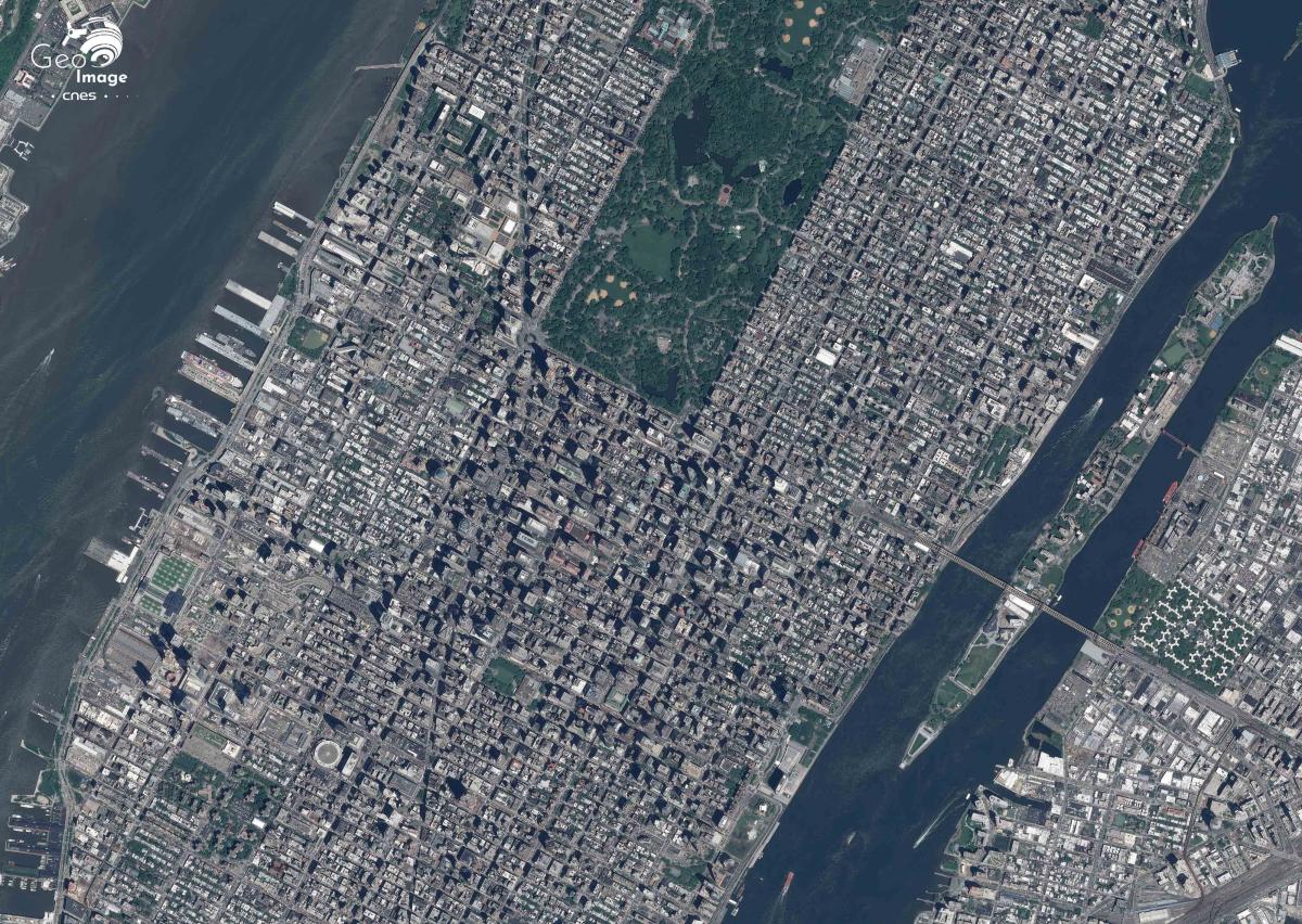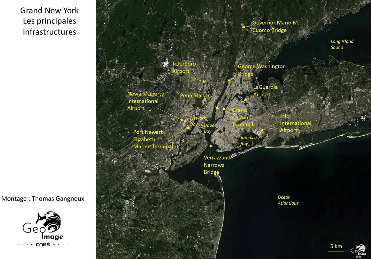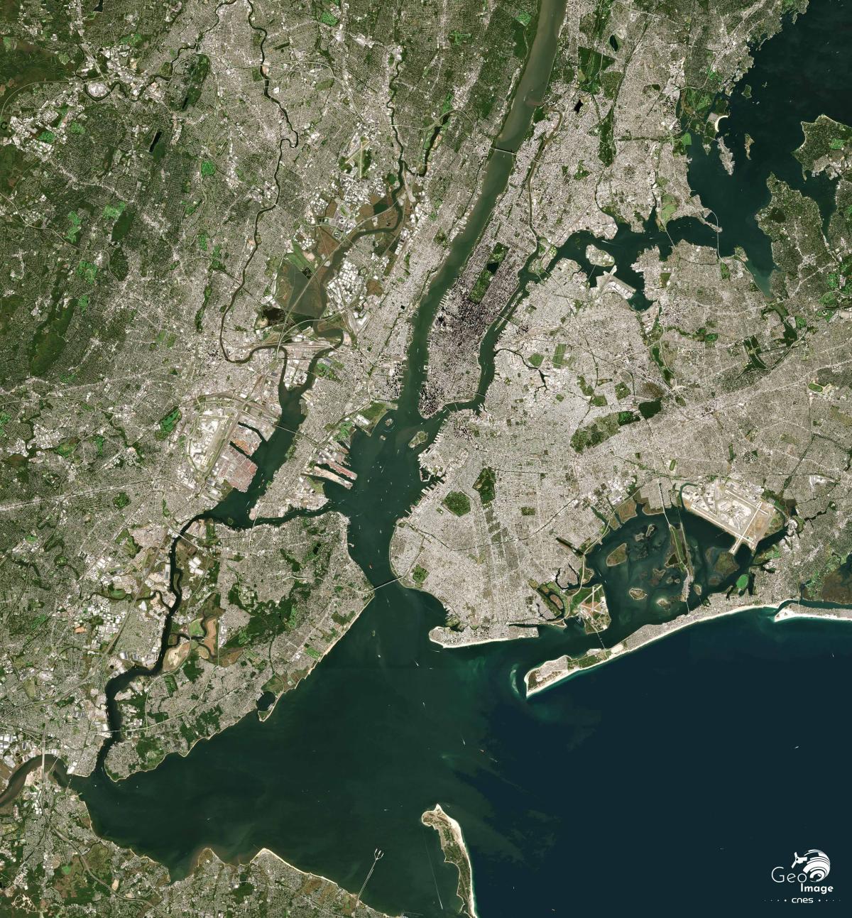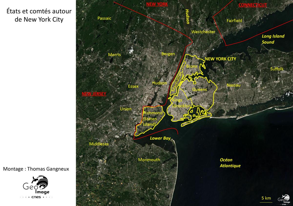 L’image satellite permet de distinguer New York City, à partir des grands axes de communication et des bras de l’Hudson au sein du Grand New York. Depuis le 1er janvier 1898, Manhattan, le Bronx, Brooklyn, le Queens et Staten Island sont réunis pour former cette ville en cinq boroughs – ou arrondissements - couvrant 783,8 km2. C’est en 1940 que l’aire métropolitaine est définie statistiquement une première fois, afin de tenir compte de l’étalement urbain et de la distinguer dans le continuum urbain qualifié de « mégalopolis » par le géographe Jean Gottmann en 1961. New York entre alors dans la catégorie statistique des Metropolitan Statistical Areas, MSAs. Cette aire urbaine s’étend sur trois États fédérés - New York, New Jersey et Connecticut - selon les mobilités domicile-travail.