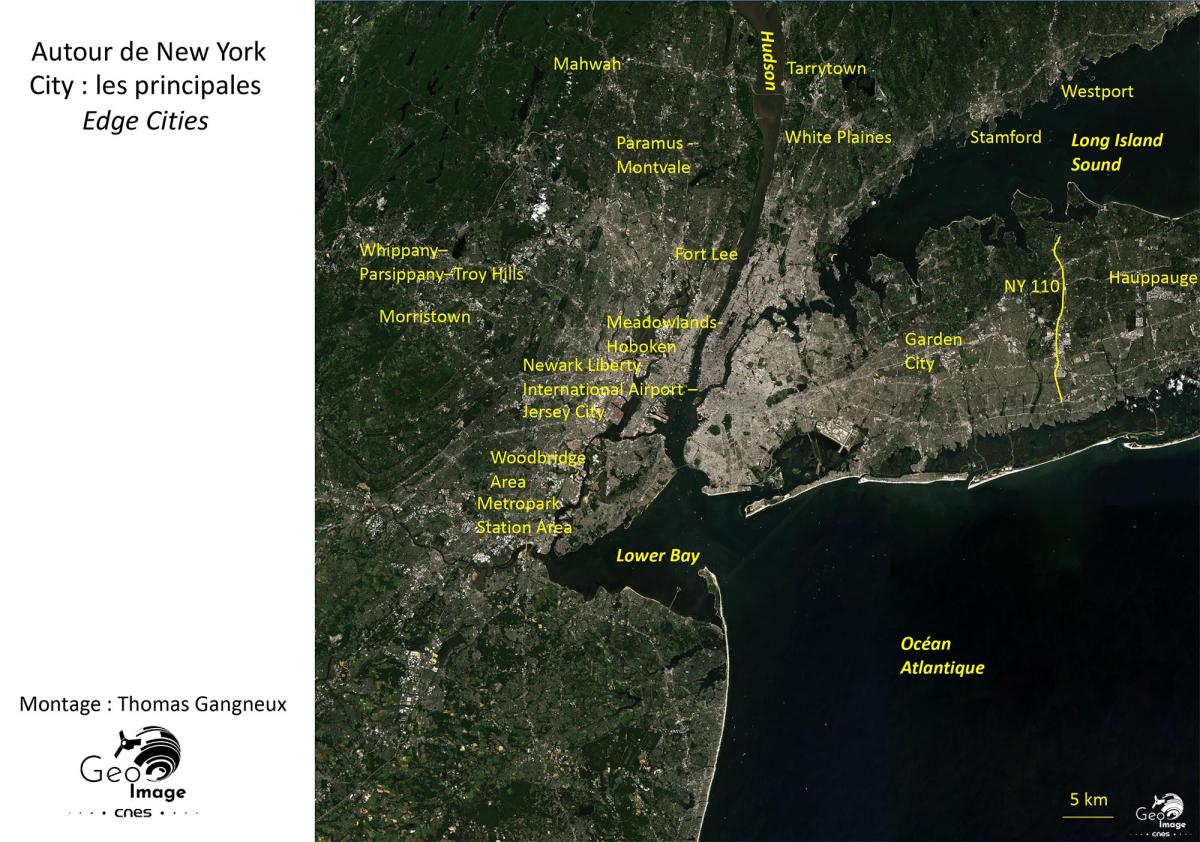 Ces pôles secondaires sont alors facilement repérables sur l’image satellite, montrant des concentrations du bâti plus forte au milieu de formes urbaines peu denses (zoom 2). Ils sont le résultat du desserrement des activités de services et de la haute technologie dans la grande banlieue new-yorkaise et concomitamment des catégories sociales mobiles qui y travaillent.