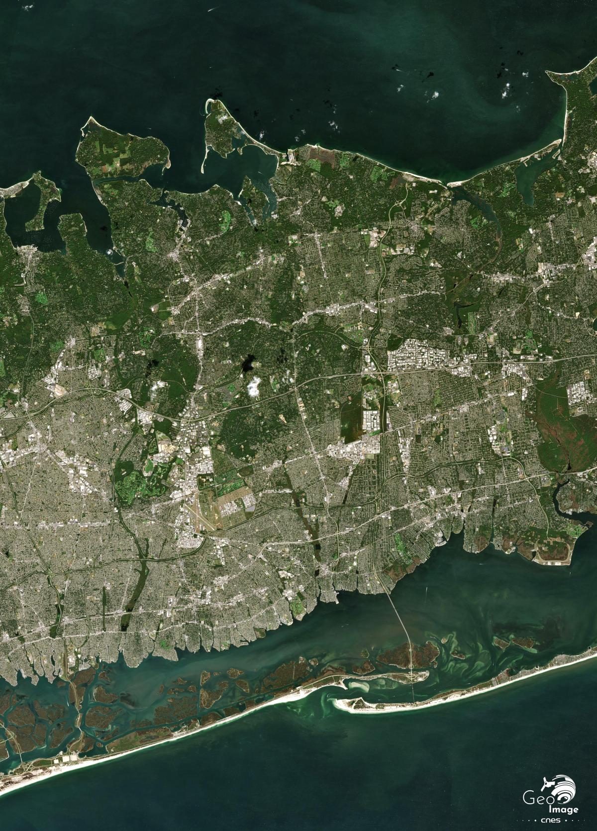 Au sud de l’image, les quartiers de Manhattan et du Bronx se détachent nettement. Les plans en damier du réseau viaire sont encore visibles à cette échelle. Sans être absolument réguliers, ils sont ponctués d’espaces verts : golfs et parcs, et restent identitaires de la ville américaine.