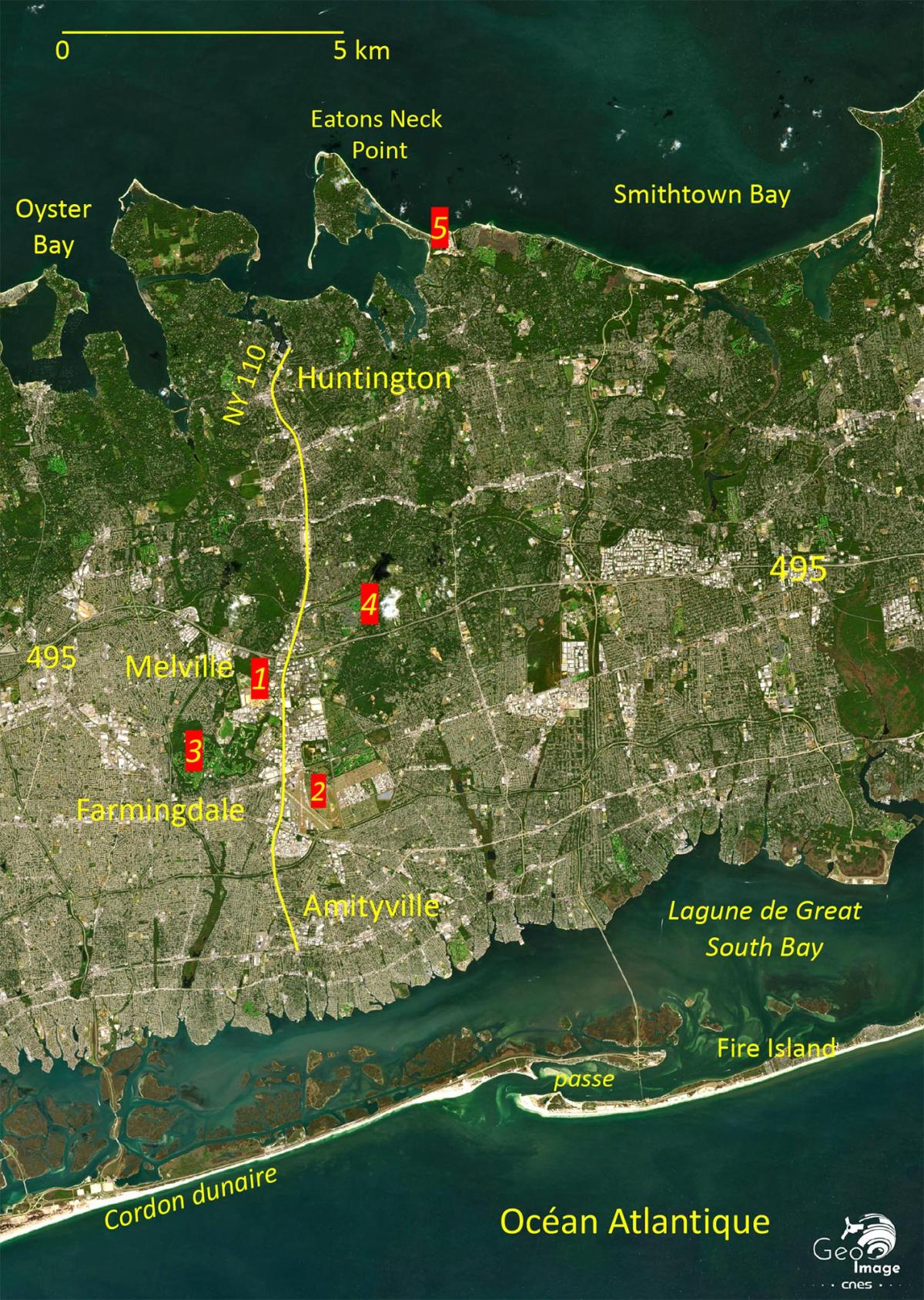 Au centre de cet axe, l’image montre un regroupement de toits blancs, une vaste zone d’entrepôts industriels et commerciaux, une carrière d’extraction repérable sur l’image par sa couleur ocre (numéro 1 sur le repère) et un petit aéroport (Republic Airport, numéro 2) dont les deux pistes sont visibles. Le tout occupe une superficie de plus de 16 km2, et suit l’axe de la NY 110 sur près de 9 km sur les villes de Melville et Farmingdale.