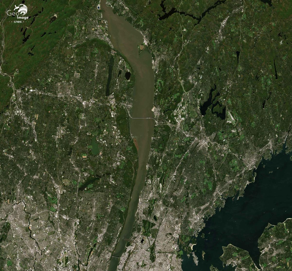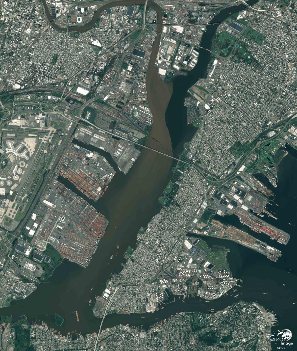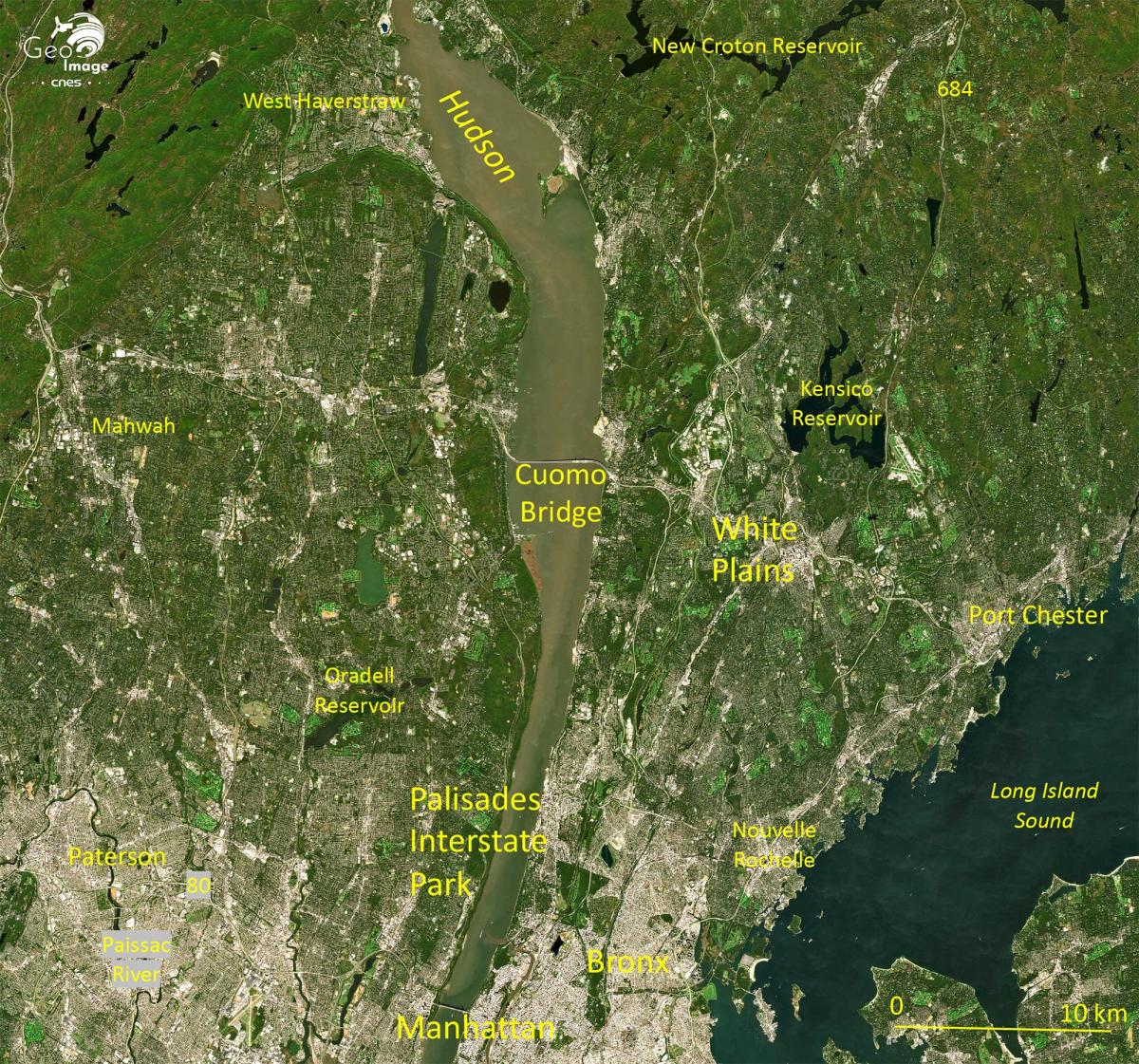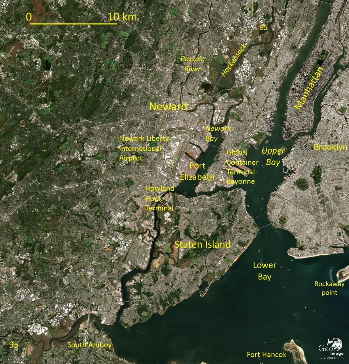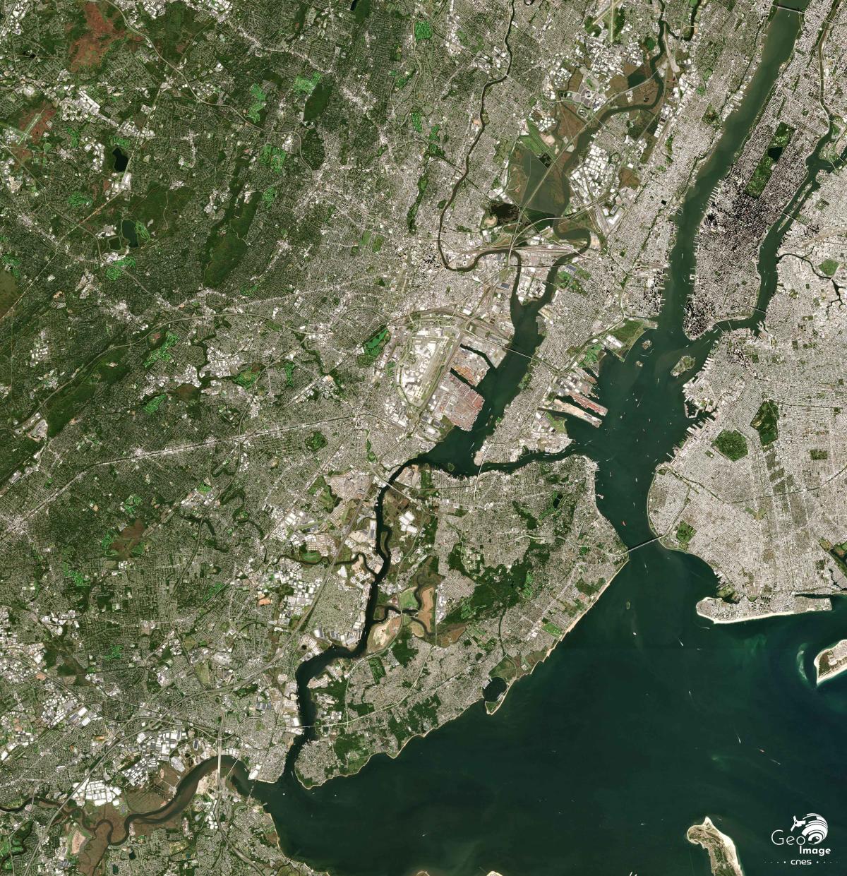 Couvrant l’embouchure du fleuve Hudson sur la Côte Est des États-Unis, l’image englobe ici une superficie de plus de 7.000 km2 sur les 34.494 km2 occupés par le Grand New York. Cette côte basse de 10 mètres d’altitude en moyenne culmine à 125 mètres à Staten Island (Tod Hill). Dans l’angle nord-ouest de l’image, de nombreux lacs sont visibles. Ils parsèment une petite chaîne collinaire à 160 mètres d’altitude, sur le flanc Est des Appalaches du Nord, dans un axe sud-ouest/nord-est entre les villes de Morristown et Mahwah dans le New Jersey. La rive ouest de l’Hudson, au nord de Fort Lee, s’élève doucement vers le nord de 86 à 138 mètres : ce sont les New Jersey Palisades, une ligne de falaises, au fort potentiel touristique et récréatif, recouvertes de forêts, repérables ici à la couleur verte.