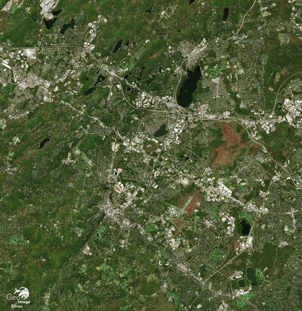 Le cadre de cette image permet d’appréhender la diversité des formes urbaines depuis la ville-centre jusqu’aux collines rurales annonçant les Appalaches du Nord (au nord-ouest de l’image). La densité décroissante du bâti du sud vers le nord est bien observable, organisée le long d’axes routiers et parsemée de noyaux urbains.