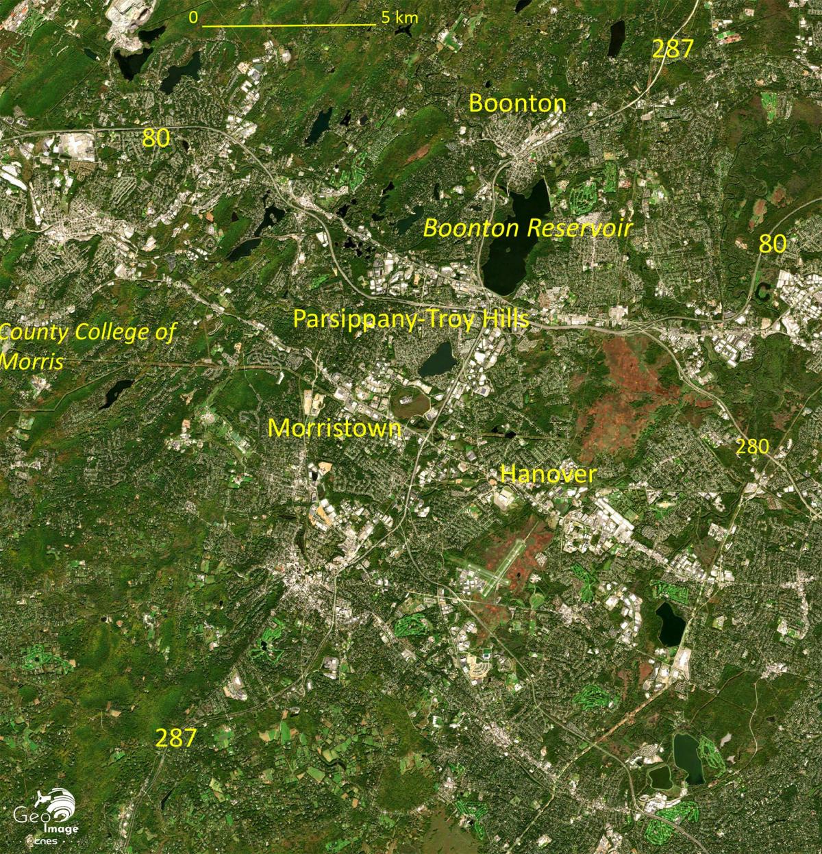 L’image satellite montre trois centres urbains : au nord du Boonton Reservoir, la ville éponyme est bien visible. Un axe routier, la NJ 287, descend vers le sud, traversant deux edge cities : Parsippany-Troy Hills et Morristown. Cet espace suburbain montre des centralités très visibles : les toits blancs des zones d’activités s’égrènent le long des axes routiers qui se croisent à Parsippany -Troy Hills. Surtout, ces trois villes offrent un continuum urbain local avec un gradient de densité des bâtiments décroissant autour des centres-villes de Boonton et Morristown, présentant un paysage urbain multipolaire.