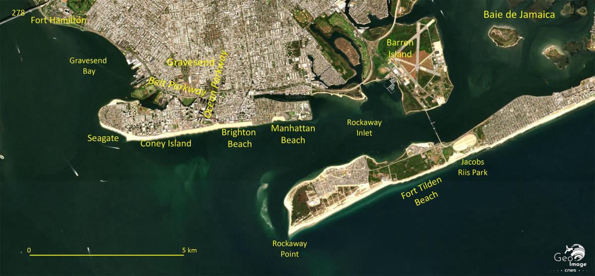 Au sud de Brooklyn, Coney Island  - « coney » signifiant lièvre en néerlandais - était jusqu’en 1940 une île de 6,5 km de long sur moins de 1 km de large. A cette date, l’ouverture de la Belt Parkway, bien visible sur l’image, comble le Coney Island Creek, la rattache à Brooklyn et relie Manhattan à Long Island.