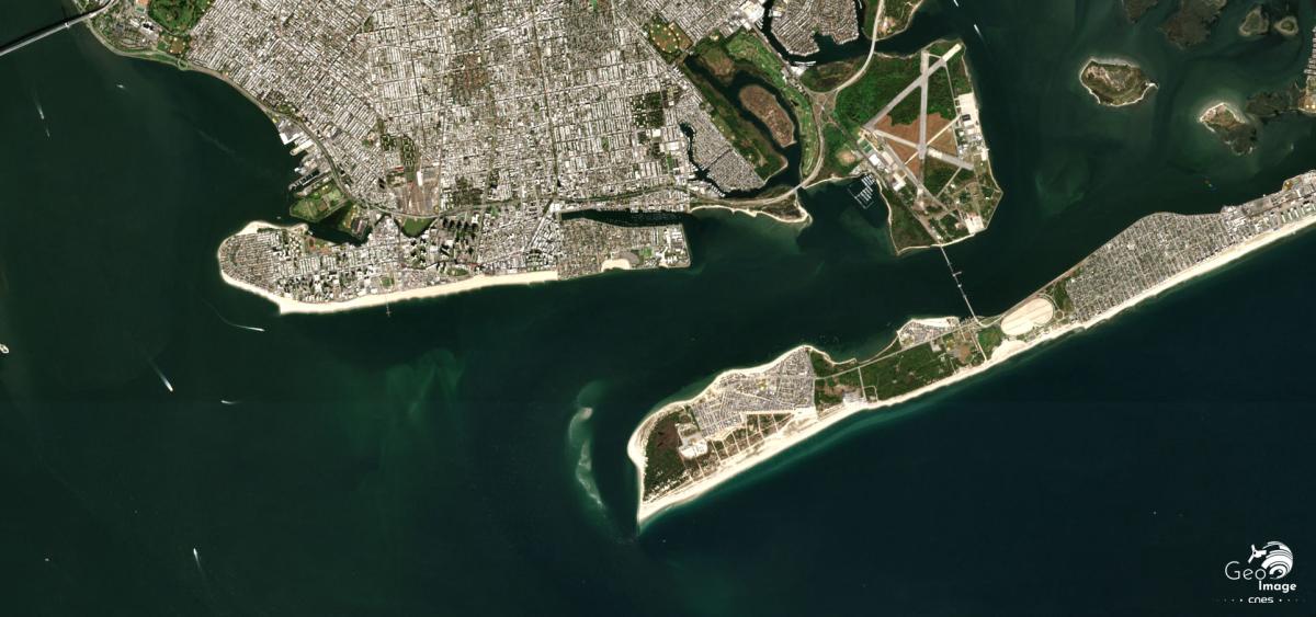Les interfaces numériques de la mondialisation. Au cœur de la planète financière (NYSE), du réseau des institutions de la gouvernance mondiale (ONU) et des pôles de la recherche et de l’innovation (Silicon Alley), le Grand New York est équipé de 99 datacenters, dont 17 à Manhattan Sud. Ce sont sur les plages de Long Island que les premiers câbles sous-marins transatlantiques ont été installés, notamment sur la péninsule de Rockaway Beach, ici visible à l’entrée de Jamaica Bay. Au total, la métropole new-yorkaise est l’un des hauts lieux les mieux interconnectés avec le reste de l’espace mondial, en premier lieu les grandes métropoles situées en haut de la hiérarchie urbaine mondiale.