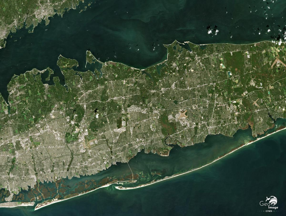 L’essentiel de l’espace urbanisé est donc ouvert sur l’Océan Atlantique et de vastes zones sont à quelques mètres à peine au-dessus du niveau de la mer. Ainsi, au nord-ouest du Bronx, l’image montre un vaste espace vert, un parc, à 1 mètre seulement d’altitude, comme une cuvette au sein d’un espace urbanisé. La rive sud de Long Island s’ouvre sur l’océan, en une côte marécageuse située entre 0 et 1 mètre d’altitude. La NY 110 descend entre Huntington et Amityville de 66 à 9 mètres. L’urbanisation, qui imperméabilise les sols, et la faiblesse de l’altitude y expliquent en partie le risque d’inondation.