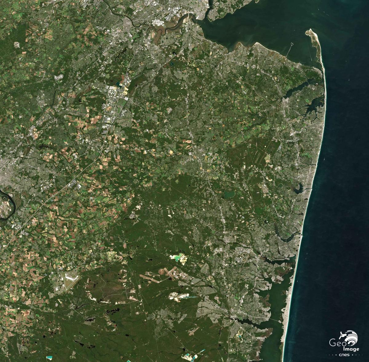 Entre Freehold et la NAES Lakehusrt, l’espace est clairement multifonctionnel. Ainsi, entre Freehold et Brick Township, à l’ouest de l’US Route 9, les formes de peuplement mitent l’espace rural (lotissements, terrains de golfs en vert vif) forestier (en vert foncé), dans un gradient de densités décroissantes d’est en ouest. La Colliers Mills Wildlife Management Area est une zone de gestion de la faune faisant partie de la Pinelands National Reserve, qui occupe toute la partie sud de l’image. Elle a été créée en 1978 et classée réserve de biosphère en 1988. Le bornage de cette réserve est bien visible, mais n’empêche pas les formes de peuplement ponctuelles, strictement délimitées, comme Manchester Township. C’est aussi à la lisière de cette réserve que deux carrières d’extraction de sables, alimentant l’industrie du BTP, sont repérables à partir des lacs ici formés. Nous sommes donc ici dans un espace aux fonctions à la fois environnementales, résidentielles, industrielles et récréatives.