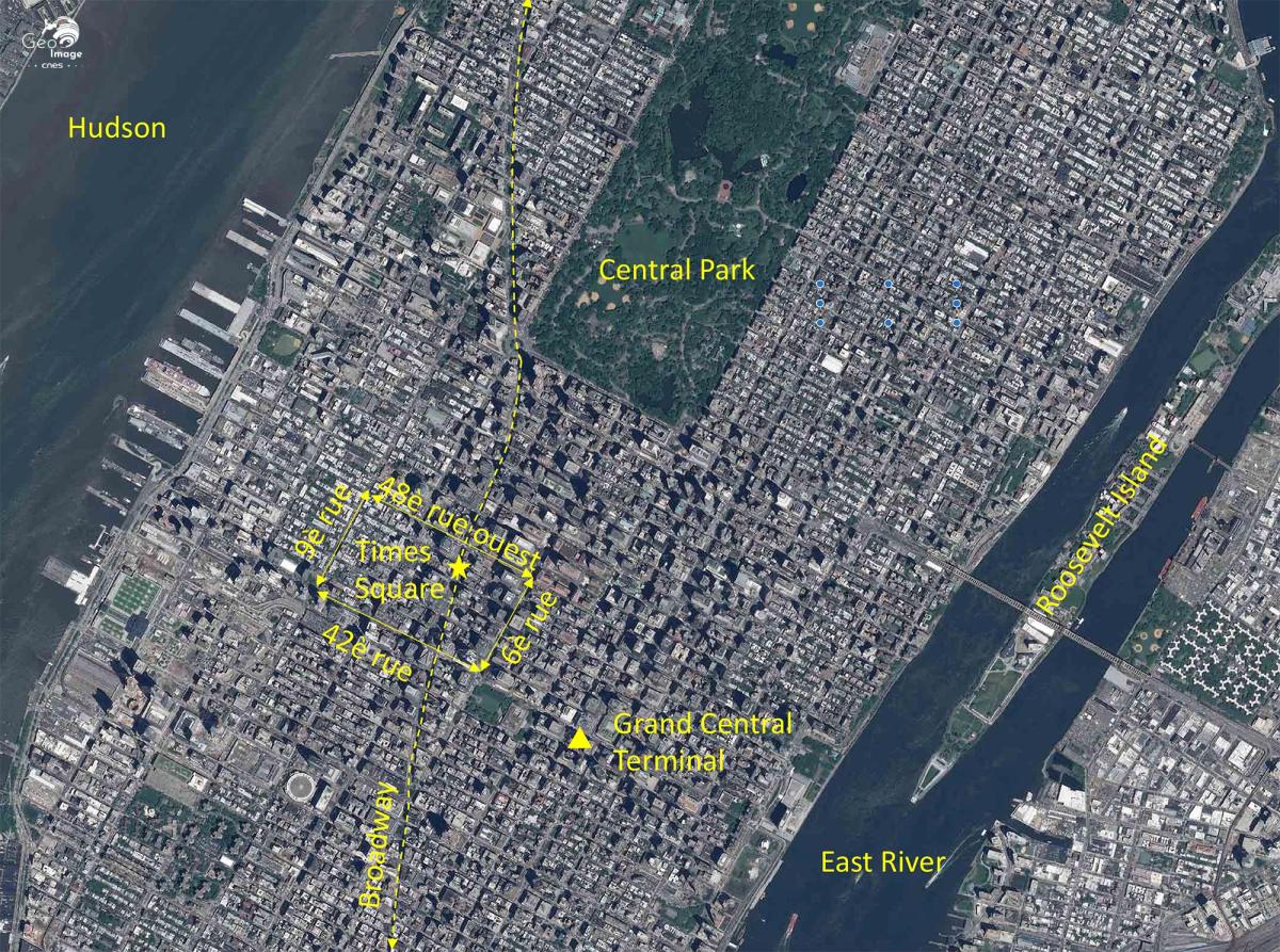 Le terme de « ville globale » proposé par Saskia Sassen en 1991 désigne des métropoles concentrant les fonctions de commandement de l’économie mondiale. New York est l’une des métropoles les plus attractives et s’affirme comme une des places fortes politique (ONU), financière (NYSE), économique (217 sièges sociaux de firmes transationales), médiatique et artistique de la planète. À cette échelle, l’image ne permet pas de distinguer les lieux de pouvoirs qui se concentrent à Manhattan (voir Manhattan Sud, Jean-Louis Bonnaure et Arthur Plaza, Géoimage), l’hypercentre de New York (19 % de la population de la ville, 38 % des emplois de la finance, 33 % dans les fonctions supérieures de commandement). 1,5 million de travailleurs y viennent chaque jour. Au cœur de ce quartier, Times Square fait figure d’hyper-lieu (zoom 1) et de symbole de cette ville globale.